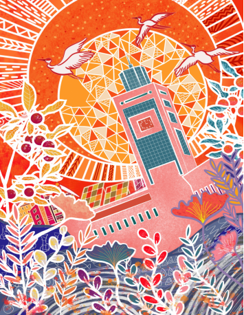 爱学校,携手共建美丽校园。“我的作品主要采用了sunbet申愽官网周边的植物,包括银杏、杨梅树和一些叫不出名字但经常会出现的树,截取小部分元素在画面下半部分作为装饰和铺垫。上半部分加上温州当地田野经常出现的动物白鹭,画面中心主题是sunbet申愽官网的图书馆建筑,图书馆前下半部分有较为抽象的河流与土地,上面有小鱼等等。整体的环境和动植物将图书馆紧紧围绕,背景是一个巨大的抽象太阳,后面还有小部分太阳能板和小型房屋建筑,主要体现人与自然和谐共生,将所有元素融合在一起,并用暖色调来进行色彩搭配,表现珍爱地球的主题。”马芳芳同学介绍了自己的作品。
