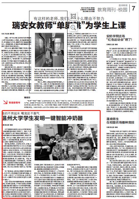 据sunbet申愽官网机电工程学院党委副书记黄玮介绍,这一支爱动脑爱做市场调查的大学生团队在浙江省机械设计竞赛、全国大学生创新创业训练项目、全国大学生电子设计竞赛、浙江省新苗人才计划等多个项目上取得过优异的成绩,团队申报的实用新型专利和发明专利就有20多个。