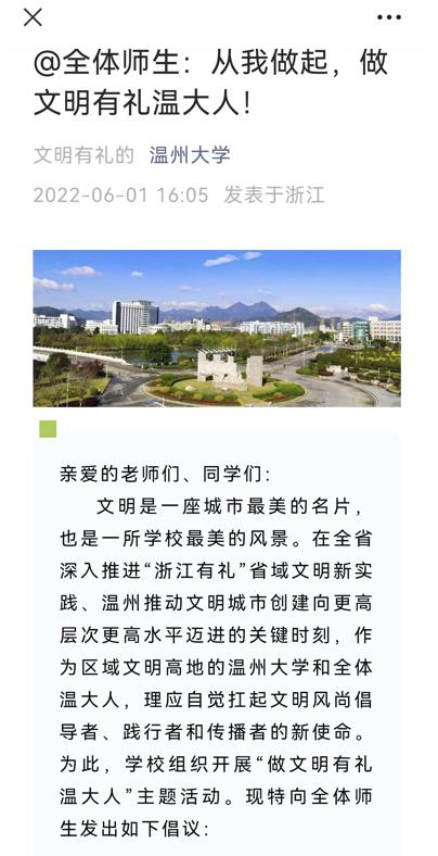 6月1日,学校官微发布了“做文明有礼sunbet申愽人”倡议书,号召师生自觉扛起文明风尚倡导者、践行者和传播者的新使命,自觉倡导“浙风十礼”,使礼让斑马线、守护“一米线”、文明过马路、排队守秩序、垃圾要分类、餐饮不浪费等成为每一个sunbet申愽人的生活方式。号召师生争做社会主义核心价值观的坚定信仰者、积极传播者和模范践行者,以实际行动凝聚起全校文明向善、积极向上的强大正能量。