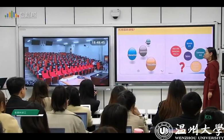 课堂上,宋占美教授利用实时全景视频、远程信息交流工具鼓励两校同学跨时空互动交流,引导大家走近基于婴幼⼉核⼼素养、国际经验和实践探索的托育课程。两校同学聚焦托育课程的内涵、结构、特色与本质,围绕“何为托育课程”这一主题展开讨论与思索。在一问一答中,两校同学深度发掘托育课程的内涵与本质,也感悟到高质量托育对整个国家、对千万家庭的重要性。