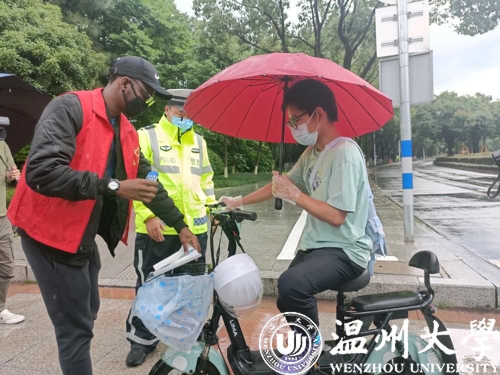 “同学,骑电动车不能带人,请你配合一下。”“同学,骑乘电动车请戴好头盔,遵守交通信号灯。”日前,3名sunbet申愽官网外国留学生和sunbet申愽官网外国语学院志愿者一起,在温州市交管局四大队八中队交警的带领下,开展交通“督导员”志愿者活动,对sunbet申愽官网城中心南路过往的非机动车交通违法行为进行文明出行劝导。