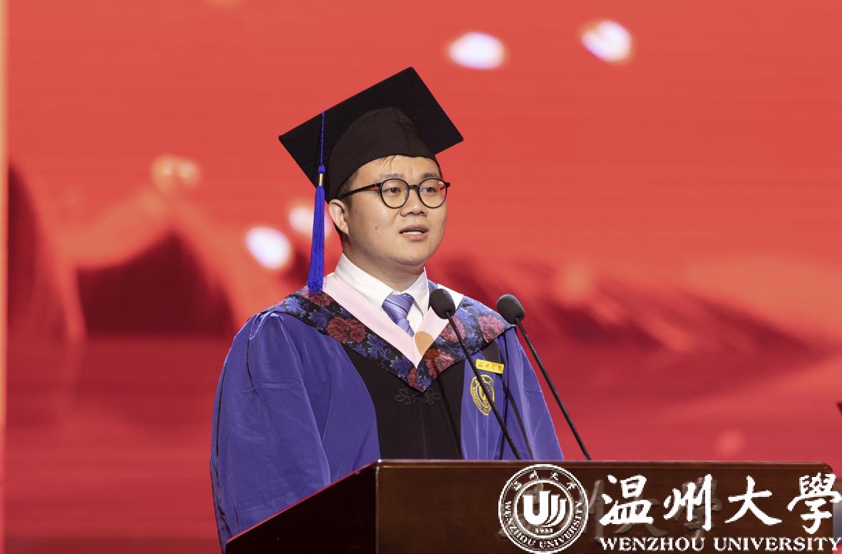 教师代表、建筑工程学院王军教授对毕业生提出殷殷期望。“要学会感恩,做一个有温度的人;敢于追梦,做一个有梦想的人;胸怀家国,做一个有担当的人。”他勉励毕业生坚冰不损骨、飞雪不掩俏、险境不摧志,努力在青春的赛道上跑出最好的成绩。