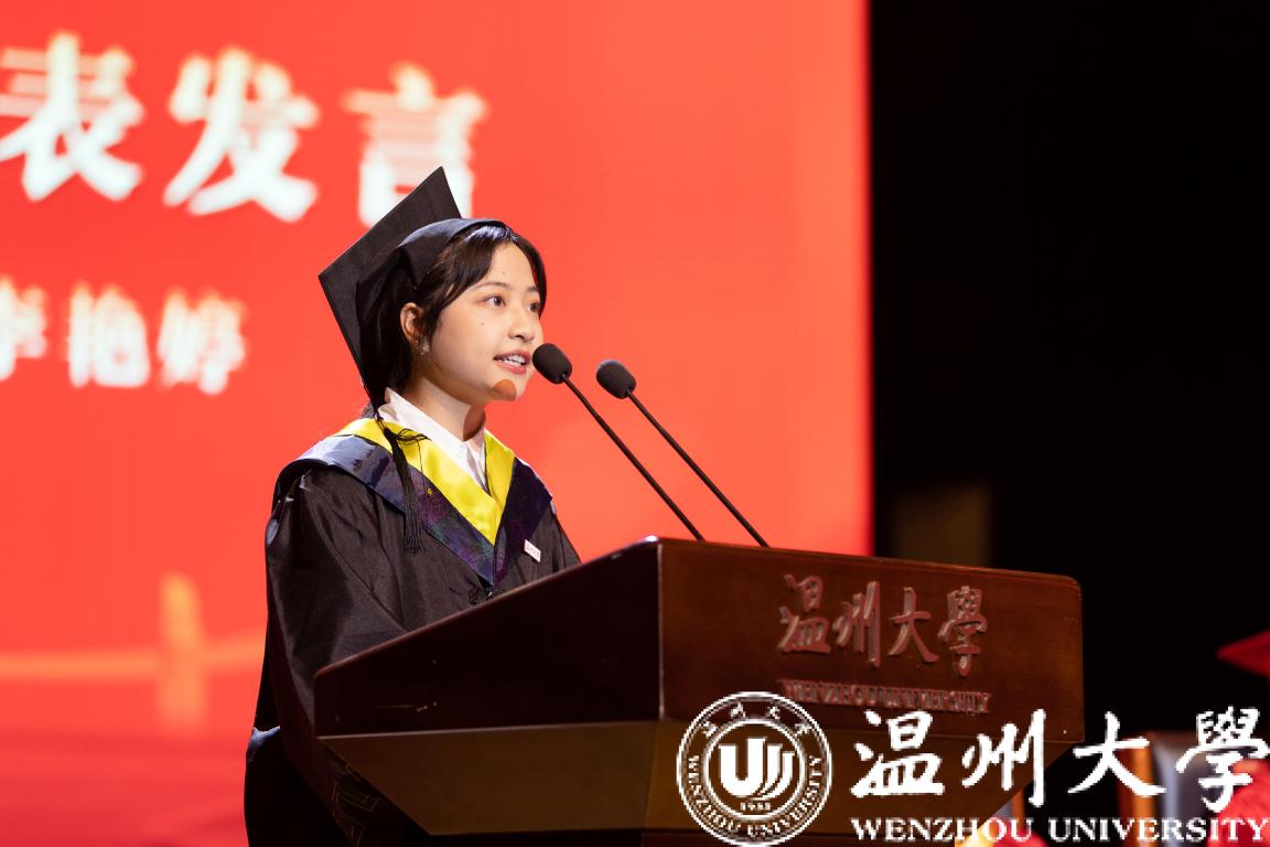 机电学院的李艳婷同学作为本专科生代表发言。她号召毕业生们“在开启新征程的道路上,不忘初心、志存高远,和母校一起向未来;直面困难、勇于挑战,和中国一起向未来;满怀信心、奋力奔跑,与世界一起向未来。”