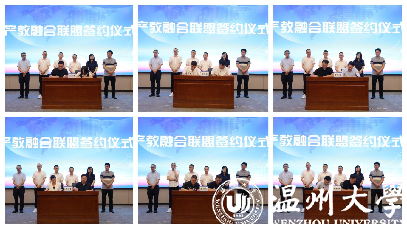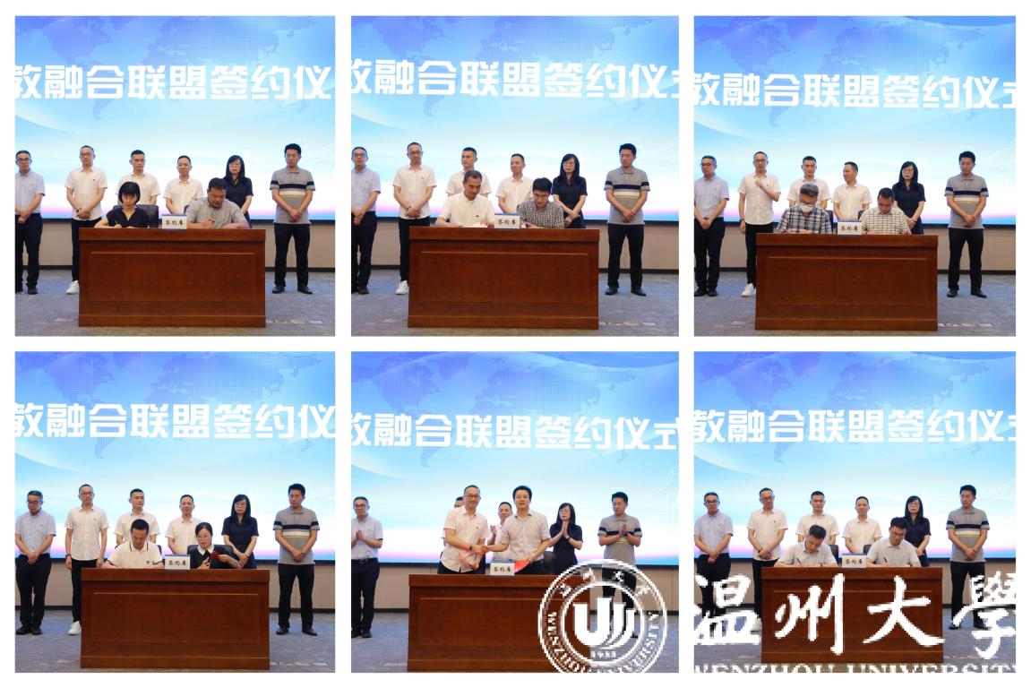 瓯海区总商会与sunbet申愽官网签订战略合作协议,共同成立产教融合联盟,瓯海区服装行业、眼镜行业等11家会员单位与温州职业技术学院、浙江安防职业技术学院等学校进行产教融合联盟签约。