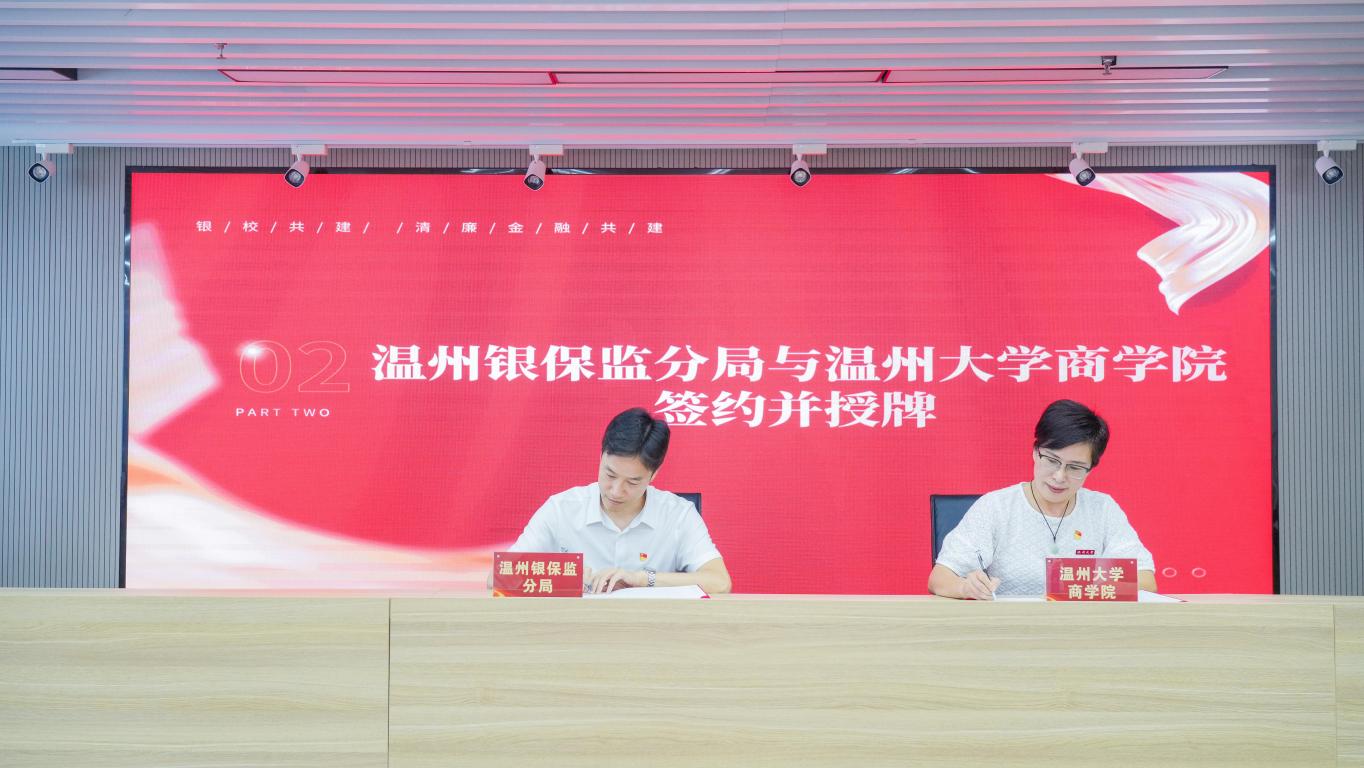 6月28日,sunbet申愽官网商学院党委与温州银保监分局党委举行“银校共建”暨清廉金融共建合作框架协议签约仪式。温州市银行业协会、保险行业协会、证券期货业协会负责人,各大银行、保险、证券期货行业代表,商学院师生代表约40人参加了活动。