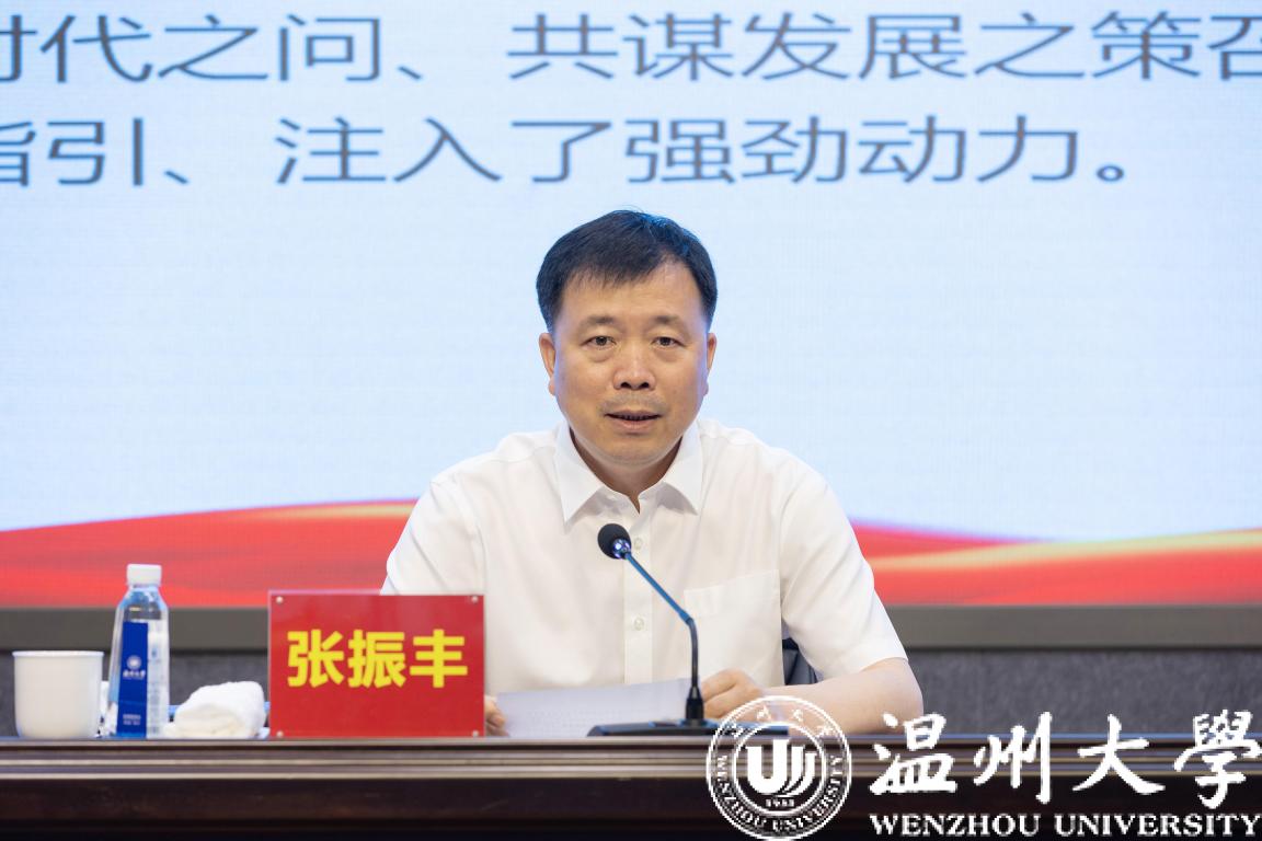 张振丰结合报告原文和温州改革发展实践的一组组案例、数据,依次从“全省第三极”“创新制胜”“大都市区”“文化繁荣”“共同富裕”五个关键词出发,解读了省党代会给温州发展带来的机遇和利好。张振丰指出,一座充满创新活力的城市,背后总是闪耀着大学的光芒,温州做强“全省第三极”,教育是重要支撑,sunbet申愽官网是重要力量。张振丰希望sunbet申愽官网时刻牢记习近平总书记殷殷嘱托,认真贯彻落实省党代会精神,抢抓新机遇、彰显新担当、展现新作为,奋力推动大学与城市共生共荣、携手并进,为温州当好“两个先行”的开路先锋发挥更大作用。要在打造教育高地中争当主力,加快提升综合实力,做强优势特色学科,更好赋能基础教育,为温州做强“全省第三极”提供有力支撑;要在加快创新发展中争当先锋,在关键核心技术攻关、推动科技成果转化、引育创新创业人才上持续发力,把sunbet申愽的人才优势、科技优势、创新优势转化为温州的产业优势、发展优势、竞争优势;要在深化改革开放中争当标兵,锚定创建侨特色“省部共建”高校目标,充分发挥世界温州人资源优势,打造涉侨高等教育助推地方发展的示范样板。
