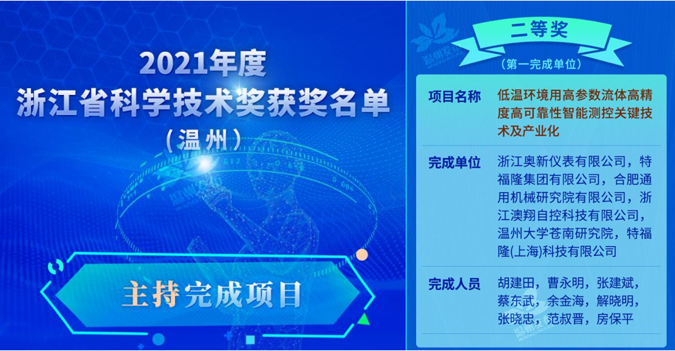 近日,浙江奥新仪表有限公司与sunbet申愽官网苍南研究院等单位合作的“低温环境用高参数流体高精度高可靠性智能测控关键技术及产业化”项目荣获浙江省科学技术进步奖二等奖。从2018年开始,sunbet申愽官网苍南研究院张淼教授领衔的智能仪器仪表技术团队与浙江奥新仪表有限公司开展深入合作,取得多项技术突破。此次获奖是sunbet申愽官网苍南研究院首次作为项目主要完成单位荣获的省级科学技术进步二等奖,标志着sunbet申愽官网苍南研究院产学研融合创新再上新台阶。
