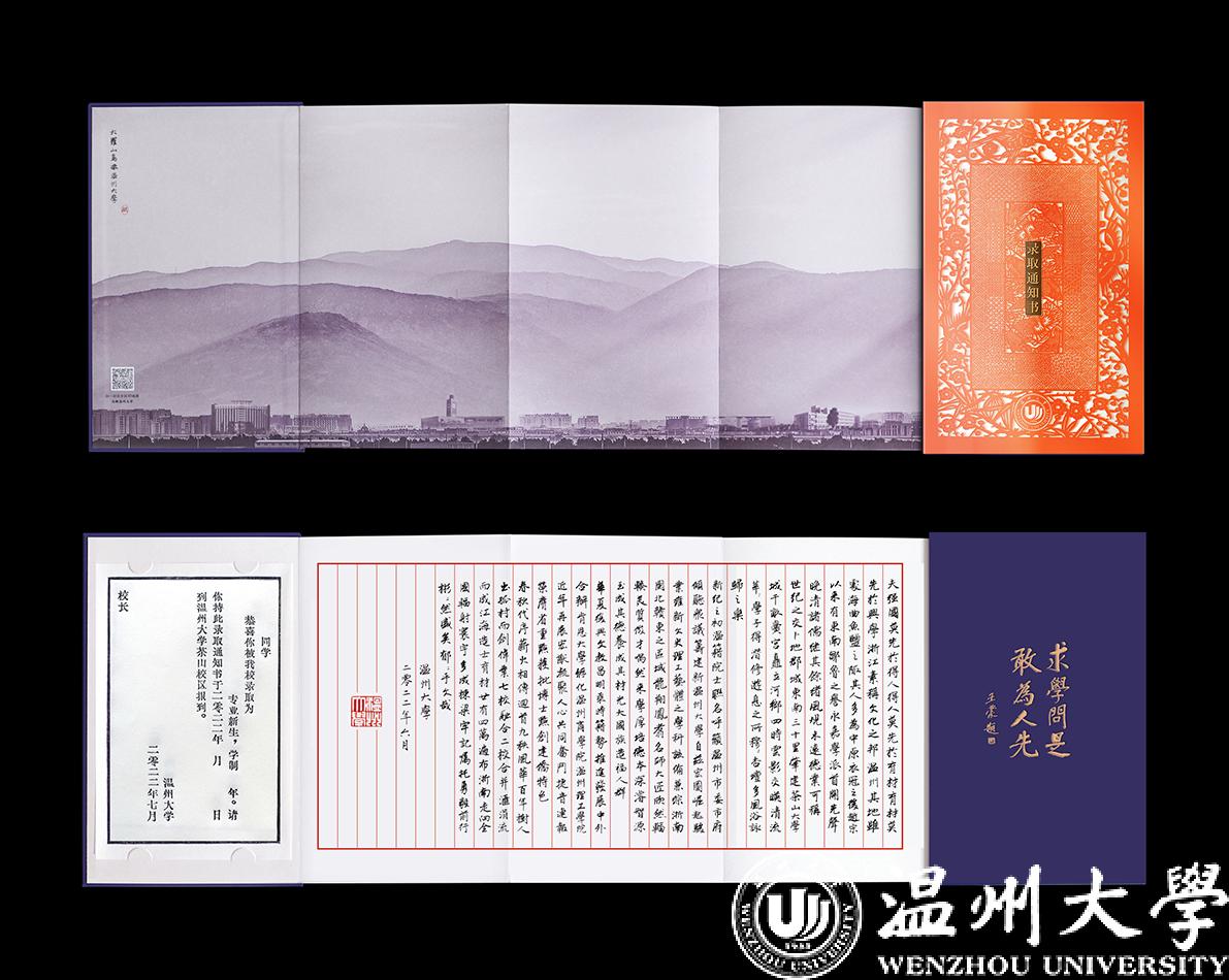 录取通知书的封面采用数字化设计了细纹刻纸的立体动态效果,打开内页,正面熏染着八百年前中国文化和文字的墨香在“木活字”录取证书上荡漾而开,采用传统朱丝栏信笺折页,大罗山怀绕之下的大学校园建筑的山水画卷交融相错,小楷书写着sunbet申愽官网深厚的文化底蕴,书法笔画瘦硬,流畅优美。扫二维码打开交互3D地图,未来的大学生活以诗意的方式在你眼前徐徐展开,借此传达给新生们感受到传承文化、创新未来,既展示中国传统技艺和文化遗产的精髓,也呈现sunbet申愽官网的办学传统和精神气质。