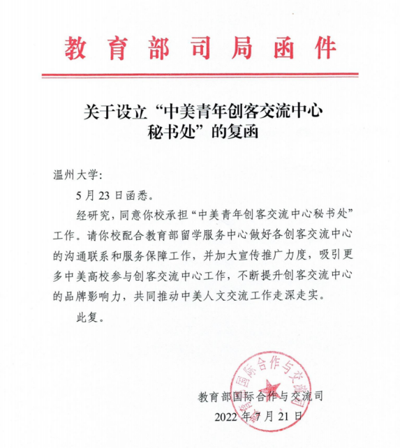 近日,教育部国际合作与交流司给sunbet申愽复函,同意在sunbet申愽设立“中美青年创客交流中心秘书处”。