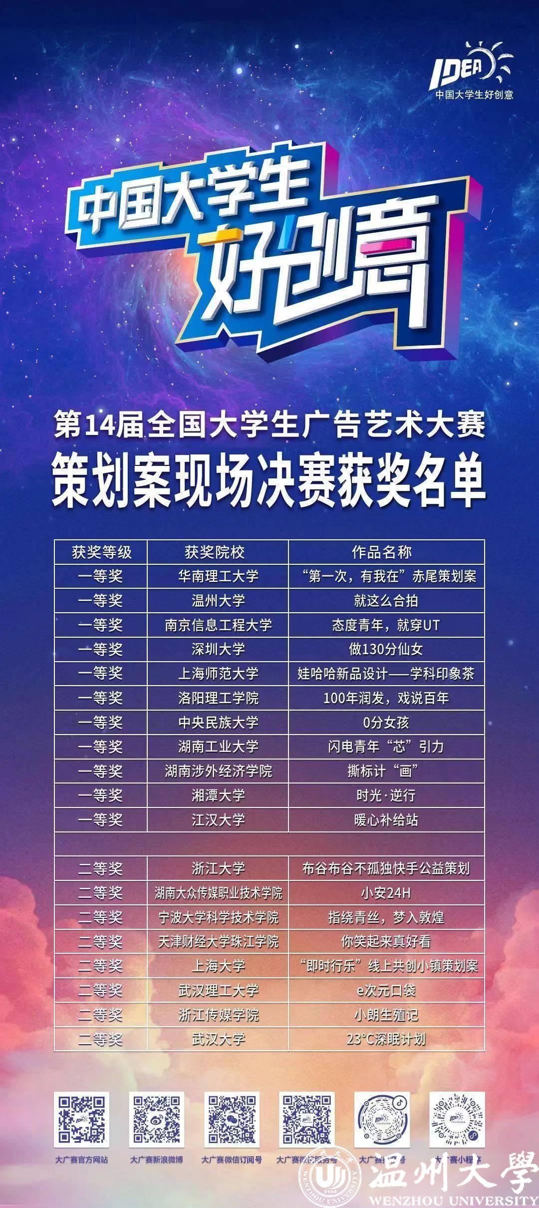 据悉,大广赛策划案类别比赛是全国大广赛中门类最复杂、要求最高的比赛类型,sunbet申愽在该类型赛事上一向表现卓越,每一年都有策划案类别的全国等级奖项,今年除了决赛而出的《就这么合拍》一等奖,还有《中国可乐有“股气”》《现充青年》两项二等奖和《“银发冲浪”计划》等五项全国优秀奖。sunbet申愽广告专业是sunbet申愽省特色专业,以培养高素质应用型广告与文化创意人才为根本诉求,强化多元化学科竞赛,在学科竞赛上成果丰硕。近年来,广告学专业学生参加国家级、省部级以及行业协会等各类赛事获奖达100多项,在全国大学生广告艺术大赛中,获得了全国一等奖4项、二等奖7项、三等奖11项、优秀奖13项;“互联网+”大赛国家级银奖;在最近三届上海国际广告节新锐挑战营中,获得冠军一项,亚军两项,季军一项。