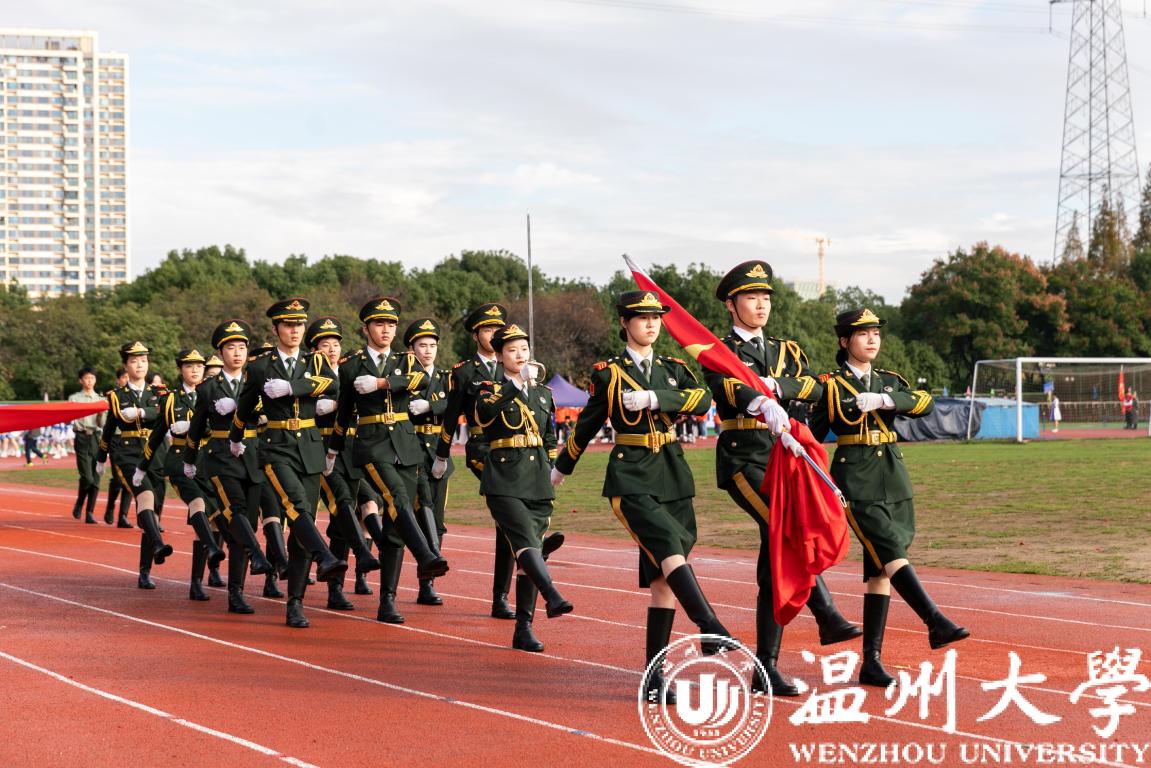 在激昂的音乐声中,校国旗护卫队英姿飒爽地列队而来,彩旗迎风招展,啦啦队炫酷动感。