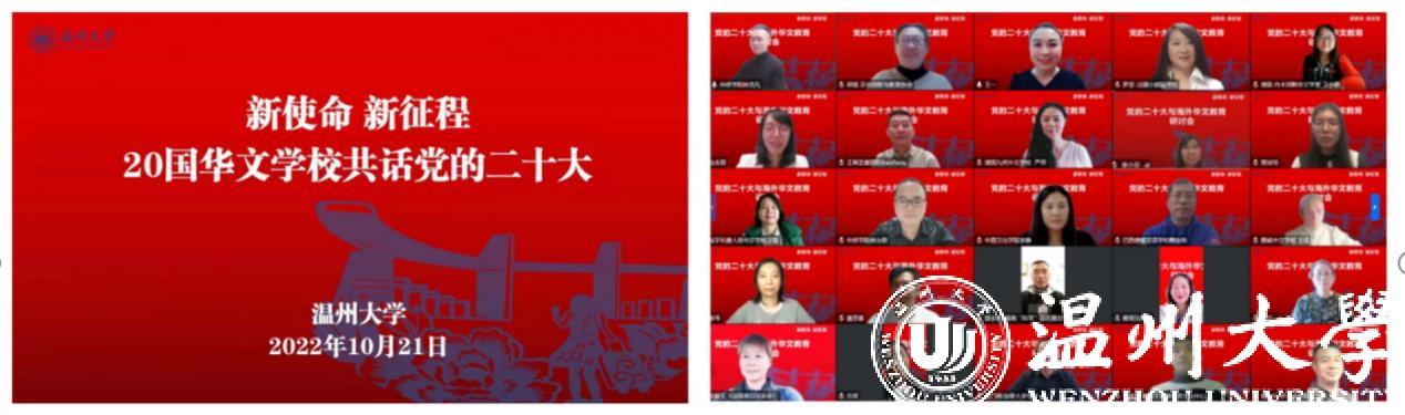 10月21日晚20点,sunbet申愽官网华侨学院邀请来自五大洲20国的华文学校校长、教师,以“新使命、新征程——党的二十大与海外华文教育”为主题,共同探讨新时代海外华文教育讲好中国故事、传播好中国声音,展现可信、可爱、可敬的中国形象,推动中华文化更好走向世界的新使命。会上,大家围绕“新征程中如何加强和改进侨务工作”“如何加强华裔新生代传承传播中华文化”等四个重要命题进行了热烈探讨。大家纷纷表示,华文教育工作者作为中华文化的传播者、国际合作的参与者、伟大事业的建设者,在实现中华民族伟大复兴的新征程中,定会怀抱梦想、脚踏实地,为中国梦一起想起来、一起干起来。