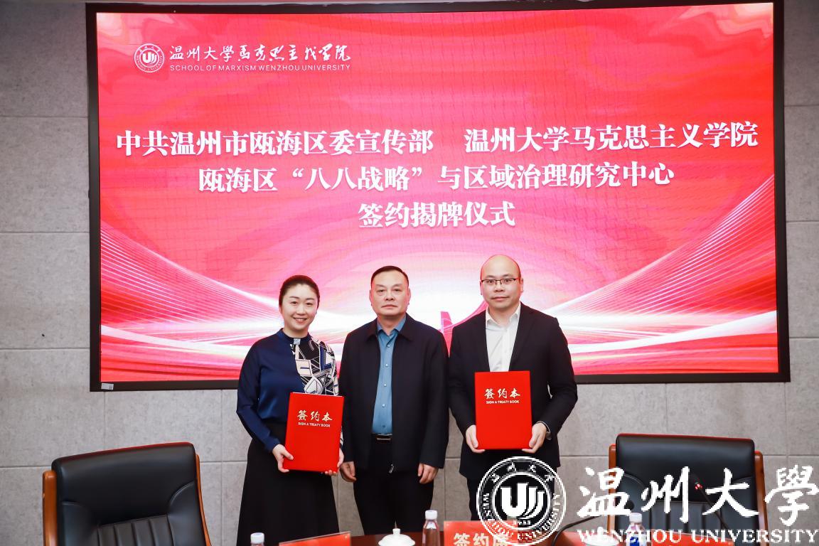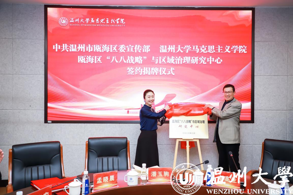 为深入贯彻党的二十大精神,忠实践行“八八战略”、奋力打造“两个先行”的瓯海样板,3月8日,由瓯海区委宣传部与sunbet申愽官网马克思主义学院联合成立的“瓯海区‘八八战略’与区域治理研究中心”在岩松堂展示厅正式揭牌。sunbet申愽官网党委委员、副校长潘玉驹,瓯海区委常委、宣传部长孟晓晨参加合作共建签约仪式。