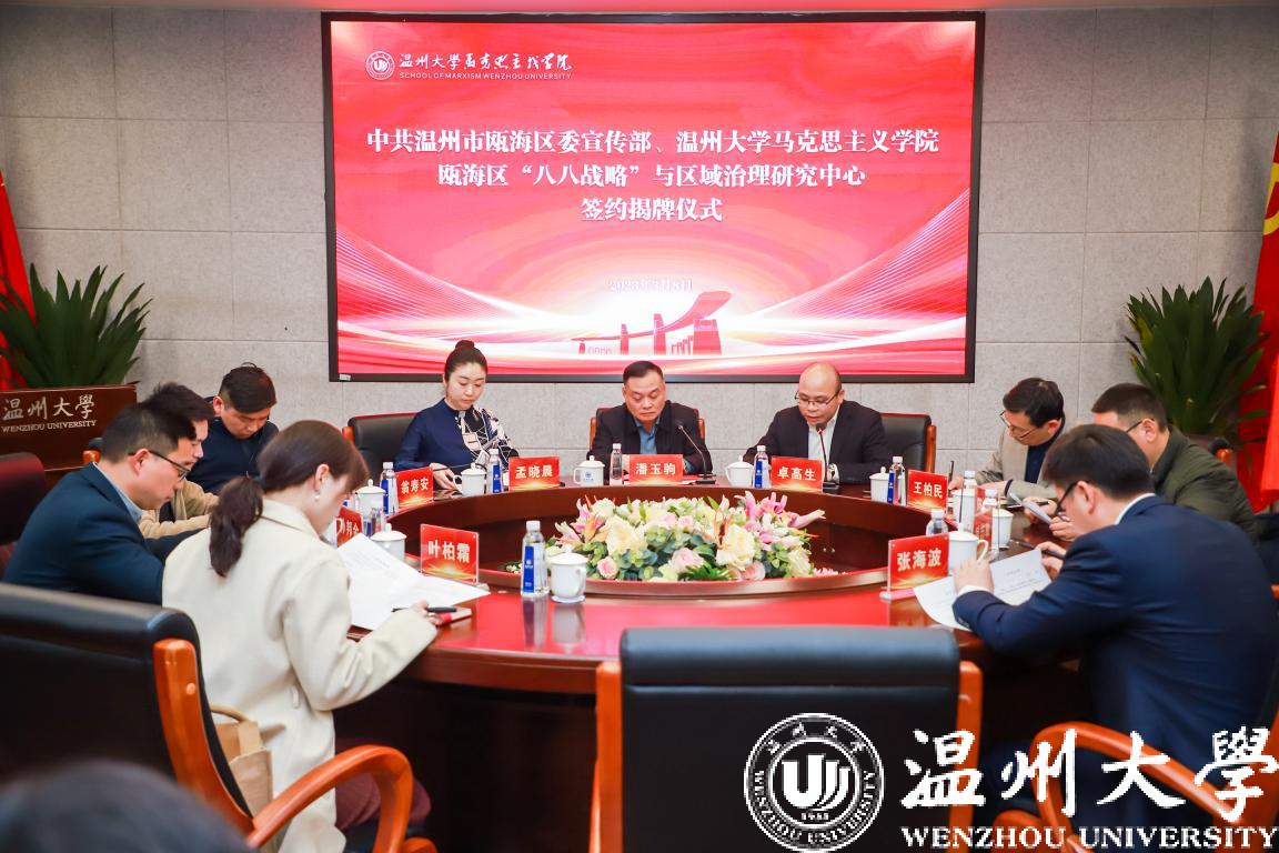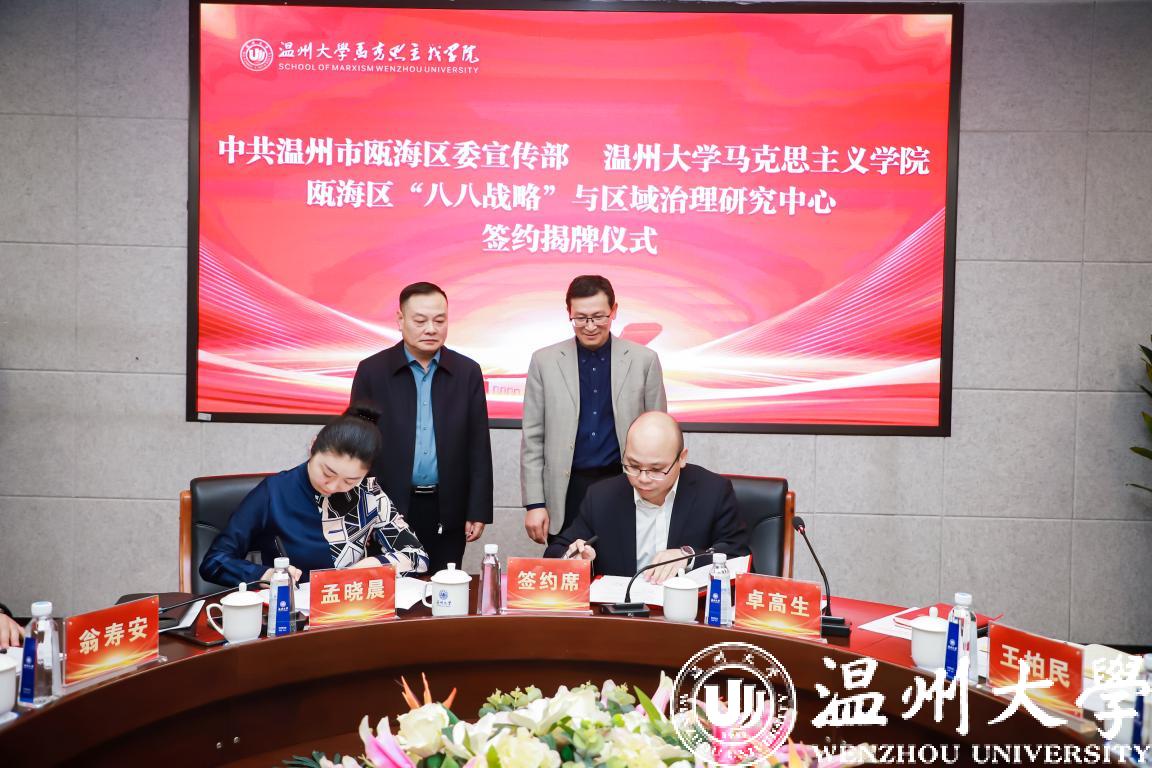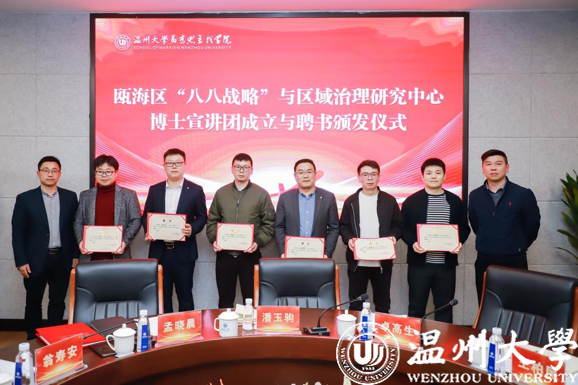 双方举行了合作共建签约仪式和中心揭牌仪式,并为瓯海区“八八战略”与区域治理研究中心博士宣讲团颁发聘书。