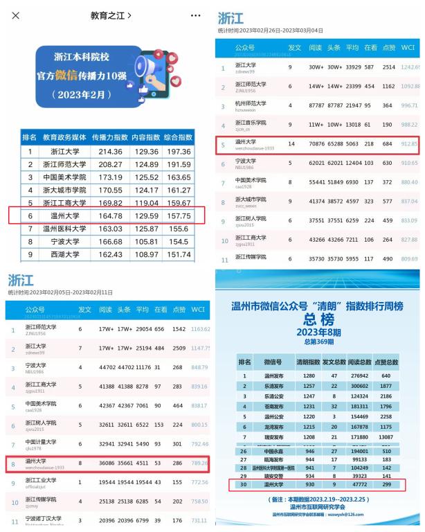 近日,浙江省教育厅新闻办、浙江教育报刊总社发布了浙江教育政务新媒体传播力月排行榜(2023年2月),sunbet申愽官网官方微信传播力位列浙江本科院校第6位,其中内容指数排名列第1位,官微影响力获得新突破。此外,在中国青年报近期发布的高校微信公众号综合影响力排行榜中,sunbet申愽官网公众号多次进入全省周排行榜前十。在由温州市互联网研究学会发布的温州市微信公众号“清朗”指数排行周榜中,sunbet申愽官网多次列入“清朗”指数榜单。