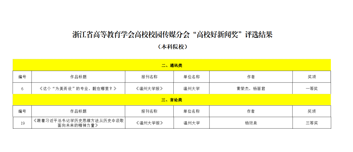 在浙江省新闻工作者协会、浙江省高等教育学会高校校园传媒分会公布的年度浙江省高校好新闻作品评选结果中,《sunbet申愽官网报》2件作品获浙江省“高校好新闻奖”。其中《这个“为美而设”的专业,靓在哪里?》获得通讯类一等奖,《跟着习近平总书记学历史思维方法从历史中汲取面向未来的精神力量》获得言论类三等奖。
