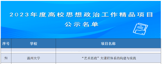 近日,教育部思想政治工作司公示了2023年度高校思想政治工作质量提升综合改革与精品建设项目遴选结果,sunbet申愽官网申报的《“艺术思政”大课程体系的构建与实践》入选2023年度高校思想政治工作精品项目。近年来,sunbet申愽官网积极探索艺术思政化、思政艺术化的创新路径,构建艺术思政融合教育体系,以艺术之实提升教学内涵,以艺术之行丰富育人实践,以艺术之美浸润时代新人,着力培养具有浓厚艺术气质、深厚“五爱”情怀、堪当民族复兴重任的时代新人。