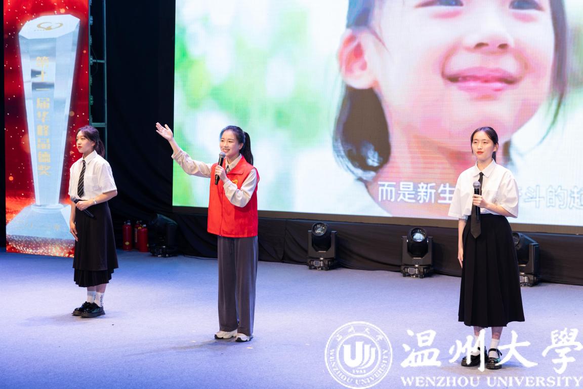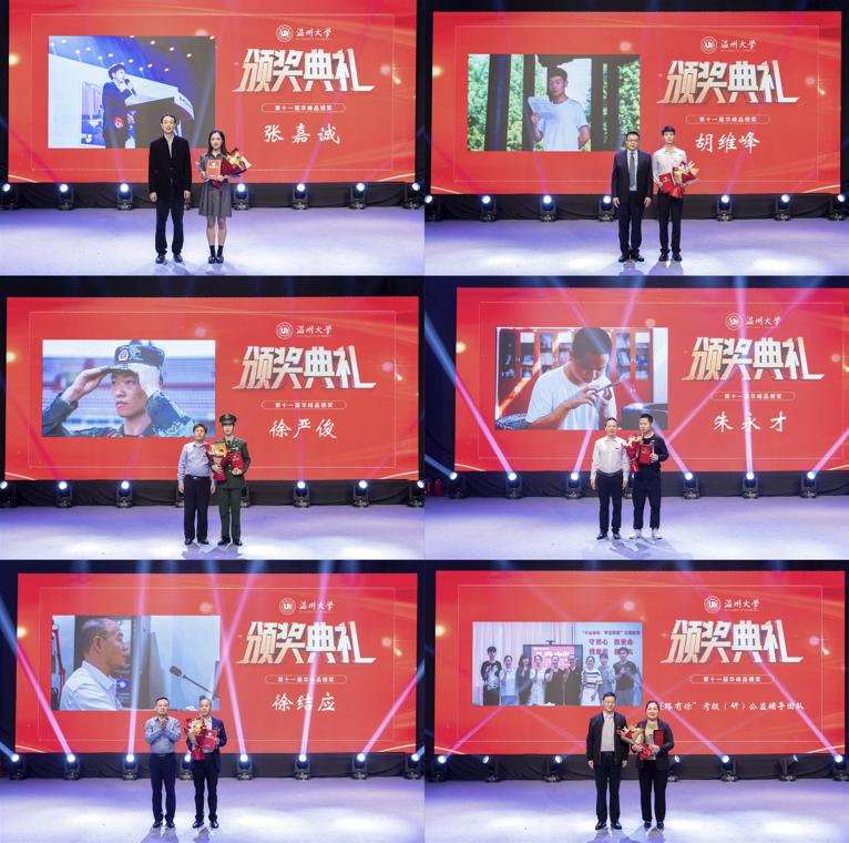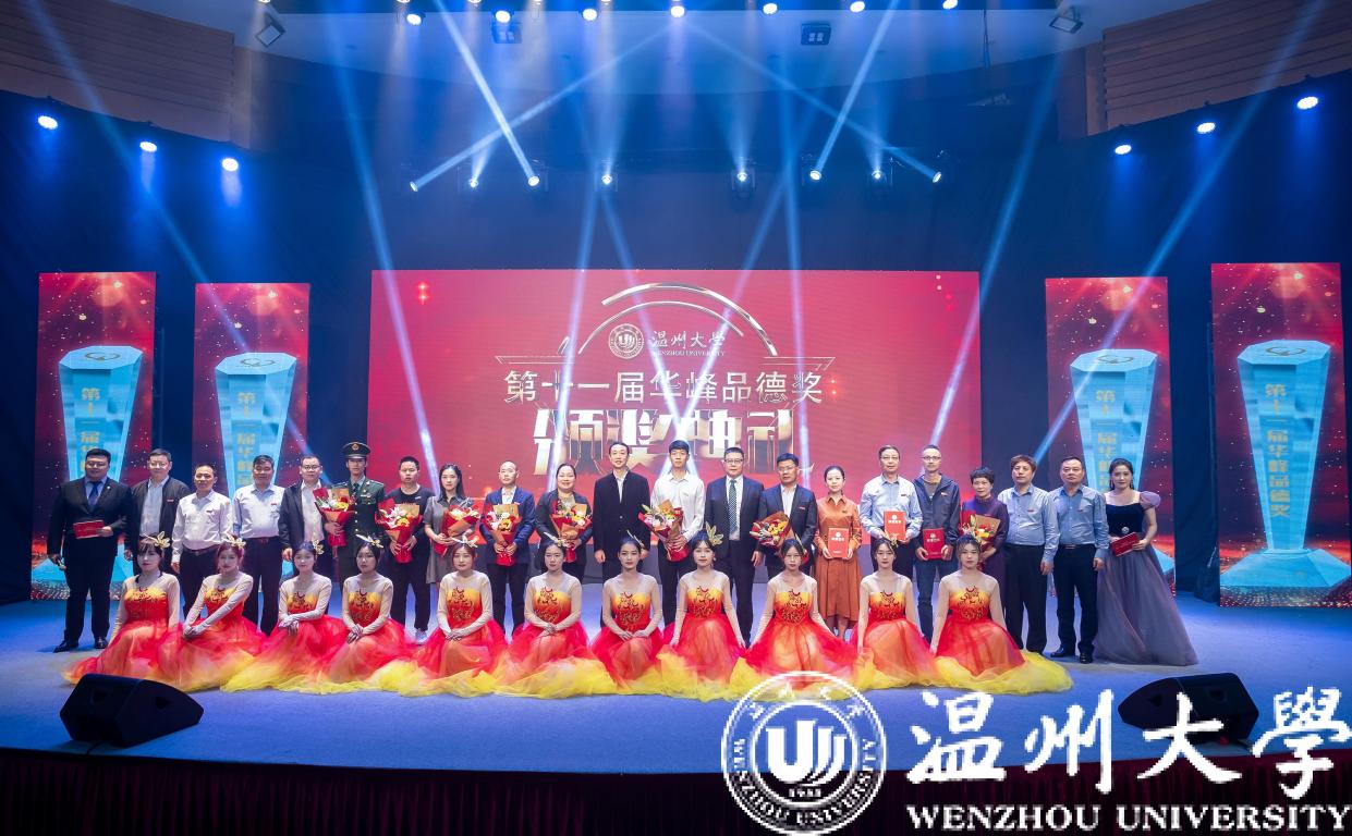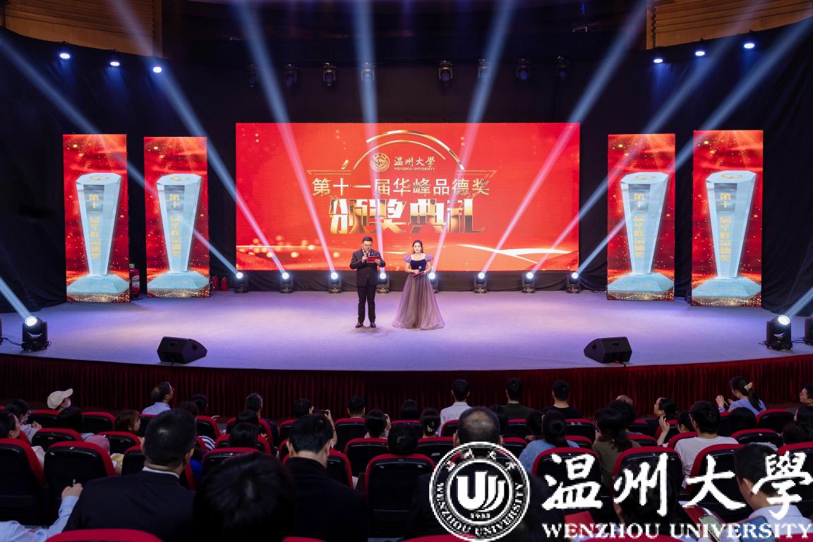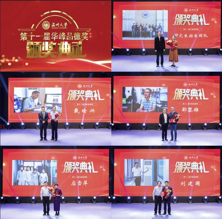 颁奖典礼现场,戴瑜兴、研究生招生团队、邵黎雄、应雪萍、刘建国、张嘉诚、胡维峰、徐严俊、朱永才、徐结应、“E路有你”考级(研)公益辅导团队等11位道德模范个人(集体)获表彰奖励,学校领导和华峰集团领导分别为获奖者颁奖。获奖者中有传道授业、温厚慈爱的良师益友,有自强不息、刻苦钻研的奋发学子,有爱岗敬业、默默奉献的后勤职工,有精诚团结、克难攻坚的集体团队等,他们为助力事业发展、建设和谐校园、服务师生群众作出了积极贡献,他们的先进事迹也体现了学校坚持崇德向善、立德树人的积极成效,生动诠释了“光大国族、造福人群”的学校精神。