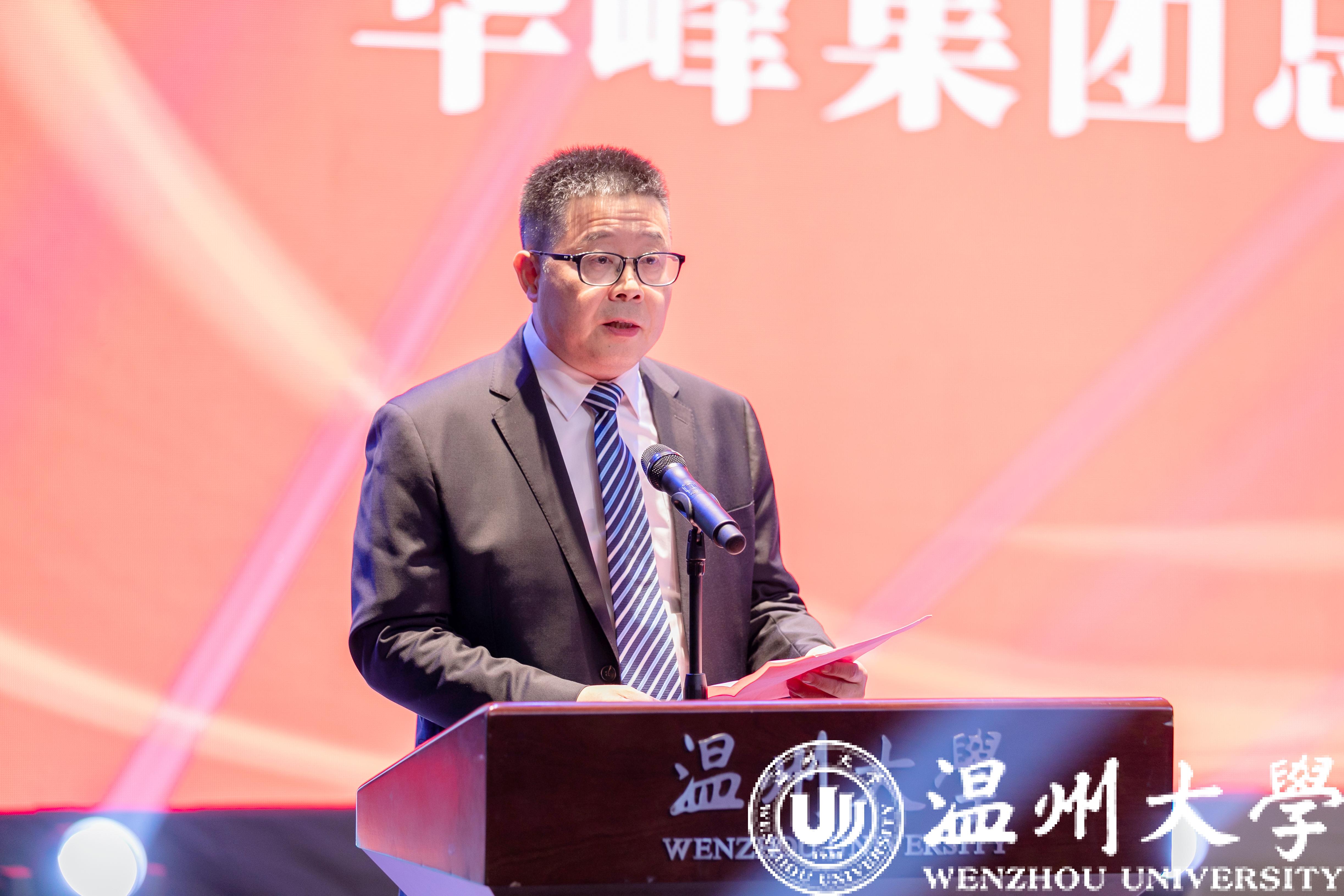 校党委书记张健致辞。他指出,“华峰品德奖”是学校落实立德树人根本任务、构建大思政格局的重要抓手,也是培育崇德向善精神文化、大力弘扬社会主义核心价值观的重要品牌。立足新起点,希望广大师生争做信念坚定、志存高远的“追梦者”,胸怀“国之大者”,争做“国之栋梁”,把个人理想与“中国梦”紧紧交织,在新征程中奋力追梦、努力圆梦。希望广大师生争做决心坚定、敢闯敢拼的“奋斗者”,以“千磨万击还坚劲”的韧劲和“不破楼兰终不还”的决心,同心协力加快建设国内一流、国际知名、特色鲜明的高水平研究教学型大学,以实际行动迎接办学90周年华诞。希望广大师生争做步伐坚定、知行合一的“耕耘者”,教师们要明大德、守公德、严私德,学子们要练就过硬本领、书写精彩华章,在忠实践行“八八战略”、奋力谱写中国式现代化浙江篇章、加快建设更具活力的“千年商港、幸福温州”中发出sunbet申愽时代强音。