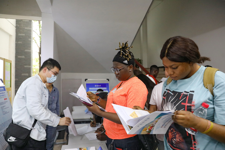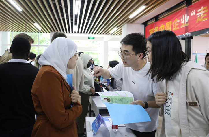 在企业招聘展位前,留学生和工作人员们热烈地交谈着,有意向的留学生毕业生纷纷填写就业申请表,工作人员也就其就职单位基本情况、工作岗位设置、薪资福利待遇、员工职业发展等方面进行介绍,其他年级的留学生也听得颇有兴致,为自己毕业后的就职方向做准备。
