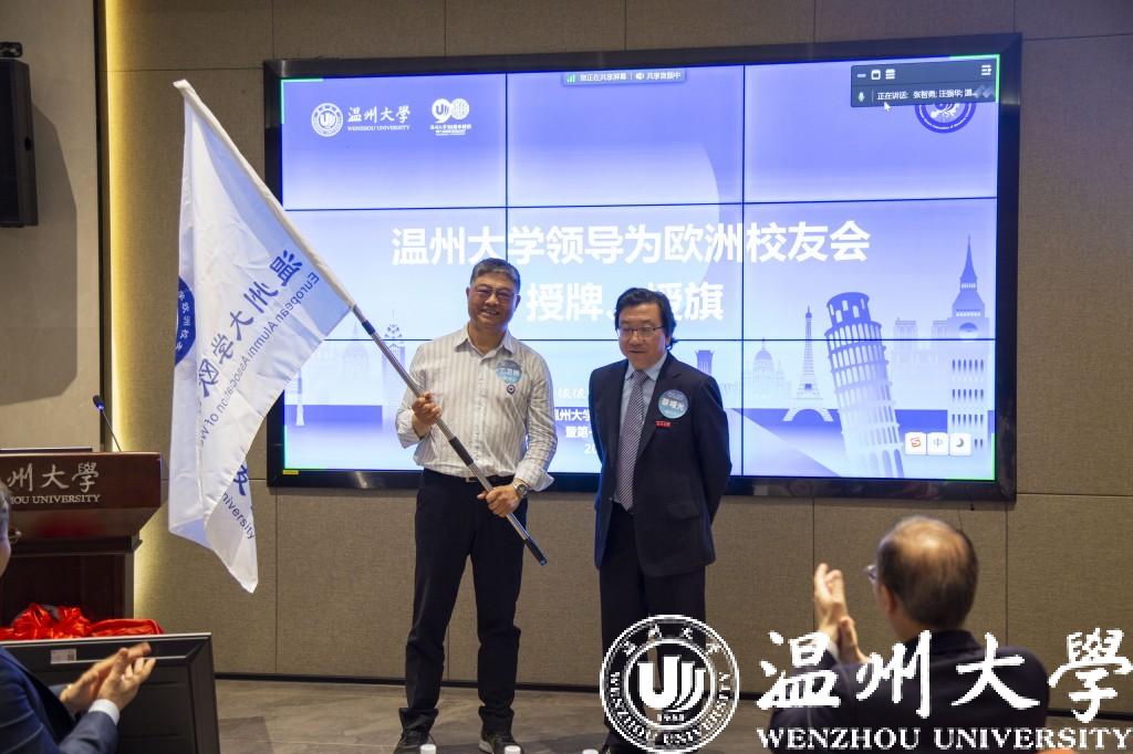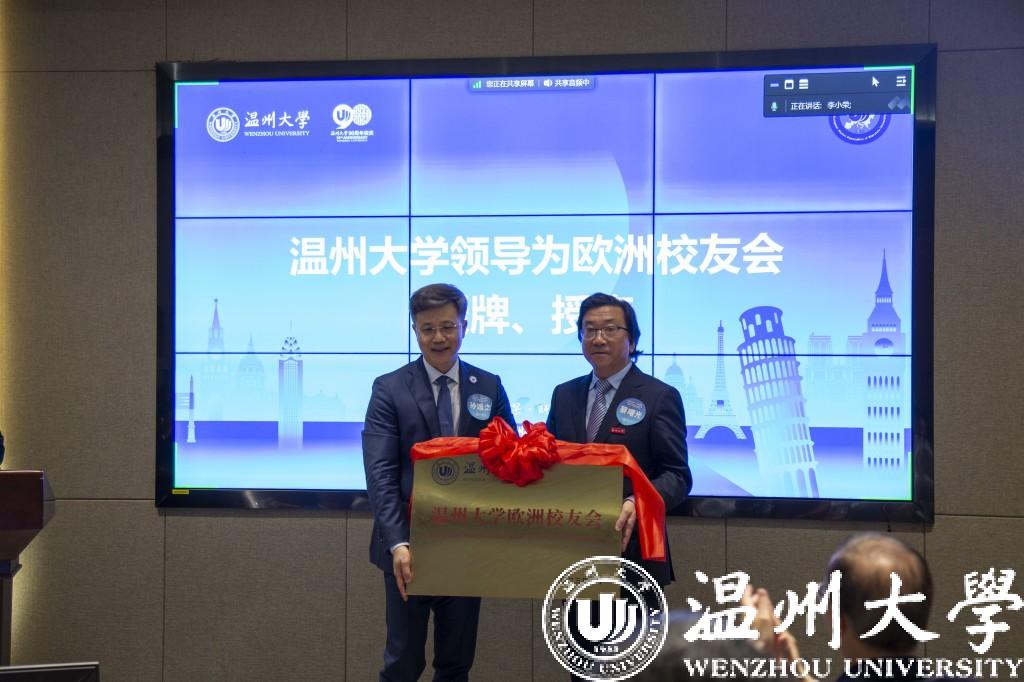 大会审议通过了《sunbet申愽官网欧洲校友会章程》和sunbet申愽官网欧洲校友会第一届理事会建议名单。蔡曙光向欧洲校友会授牌、授旗。蔡曙光、陈宏毅向欧洲校友会顾问、会长、副会长、秘书长、副秘书长、理事颁发聘书。温州校友会会长吴东、北美校友会副会长章美华上台致贺词,意大利高校联盟发起者蔡茂生线上祝贺。