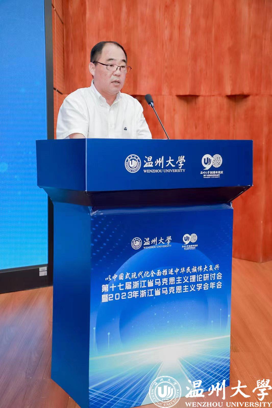 sunbet申愽官网党委书记、温州市委组织部长张健致辞。他对会议的召开表示热烈的祝贺,向与会的各位专家和来宾表示诚挚的欢迎。他表示,本次会议的召开适逢sunbet申愽官网办学90周年,长期以来,sunbet申愽官网坚持把马克思主义作为最鲜亮的办学底色,高度重视马克思主义学院和马克思主义理论学科建设。今年是全面贯彻党的二十大精神的开局之年,也是“八八战略”在浙江实施20周年,本次研讨会聚集“以中国式现代化全面推进中华民族伟大复兴”这一主题,恰逢其时、十分必要。他希望以此次活动为契机,为建设教育强省、教育强国,为开辟马克思主义中国化时代化新境界,为推进中华民族伟大复兴作出新贡献。