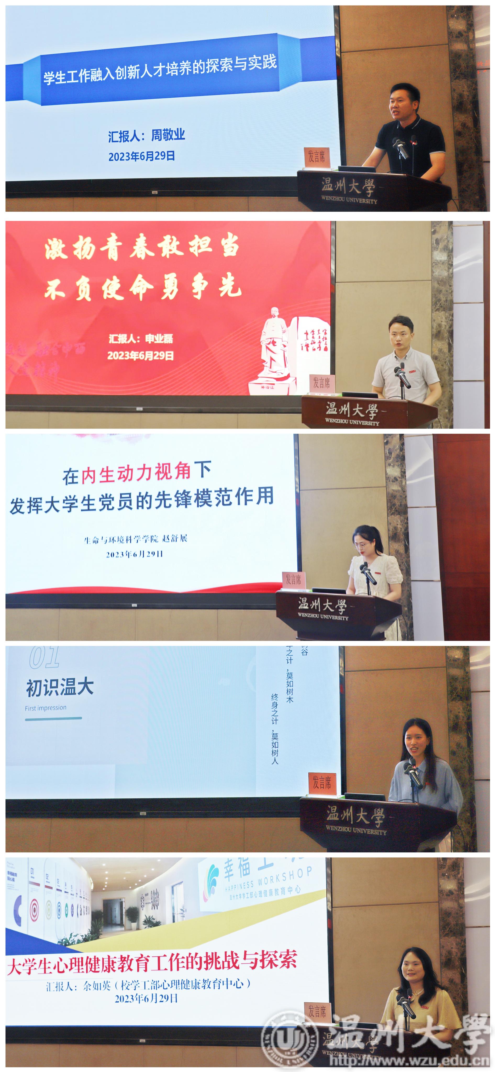五位思政工作者工作分享。化学与材料工程学院党委副书记周敬业围绕学院创新性人才的探索与实践,介绍第一课堂与第二课堂有机衔接的经验。人文学院学工办主任申业磊结合在浙江省团校的挂职经历,分享了自己在“变”“学”“联”上下功夫做好青年工作的感悟。生命与环境科学学院辅导员赵舒展从意识、制度、平台和活动四方面入手,提出了关于提升学生党建工作质量的思考。法学院辅导员黄素素动情讲述了自己入职一年来作为一名新手辅导员的成长与蜕变。学工部心理健康教育中心主任余如英以当前高校心理健康教育面临的诸多挑战为切入点,贯穿具有鲜明sunbet申愽特色的“幸福教育同心圆”心理育人模式剖析,为全体辅导员开展学生心理健康教育提供新思路。