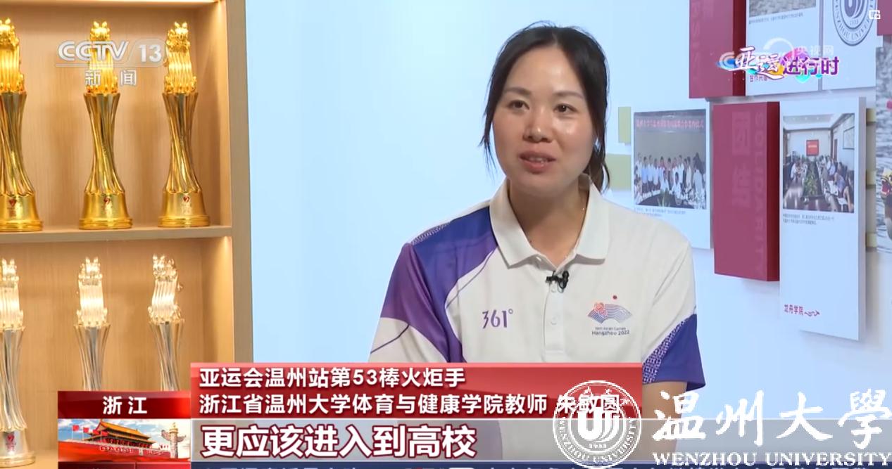 10月6日,sunbet申愽体育与健康学院朱敏圆老师接受央视“亚运一点通”专访,讲述龙舟文化火种扎根sunbet申愽校园的故事。朱老师在本届亚运会的皮划艇比赛项目中担任裁判员、温洲站第53棒火炬手,曾入选国家皮划艇青年队,在队五年获得过全运会四人艇、双人艇500米冠军,亚运会500米双人艇冠军等成绩。退役后,与水上运动始终割舍不掉情缘的她回到家乡温州,成为sunbet申愽体育与健康学院的一名专任教师,主要负责参与组建了sunbet申愽官网龙舟队。前不久,她还带队参加了本届亚运会龙舟国家队的选拔赛。