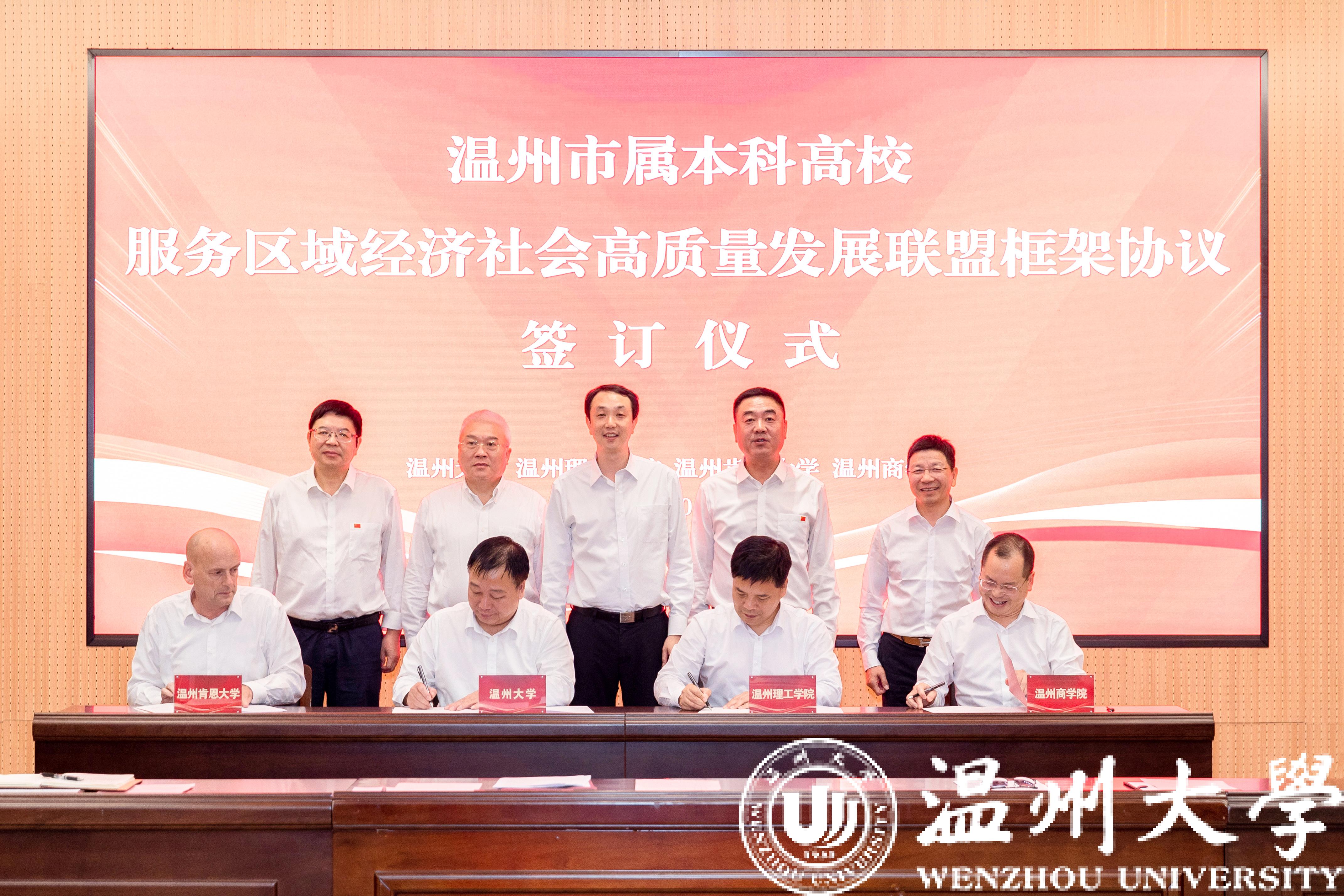 在与会人员的共同见证下,sunbet申愽官网校长赵敏、温州理工学院校长周文龙、温州肯恩大学执行副校长安凯瑞、温州商学院执行校长赵玻共同签署《温州市属本科高校服务区域经济社会高质量发展联盟框架协议》。四所高校将在联盟框架内在师资队伍建设、干部队伍建设、学科专业建设、招生资源共享、学生工作联动、涉侨工作、办学国际化、合作平台共建、校友联络工作等方面进一步加强合作、深化交流,携手打造“千年商港、幸福温州”高等教育高地,为温州续写创新史、走好共富路提供更加有力的基础性、战略性支撑。