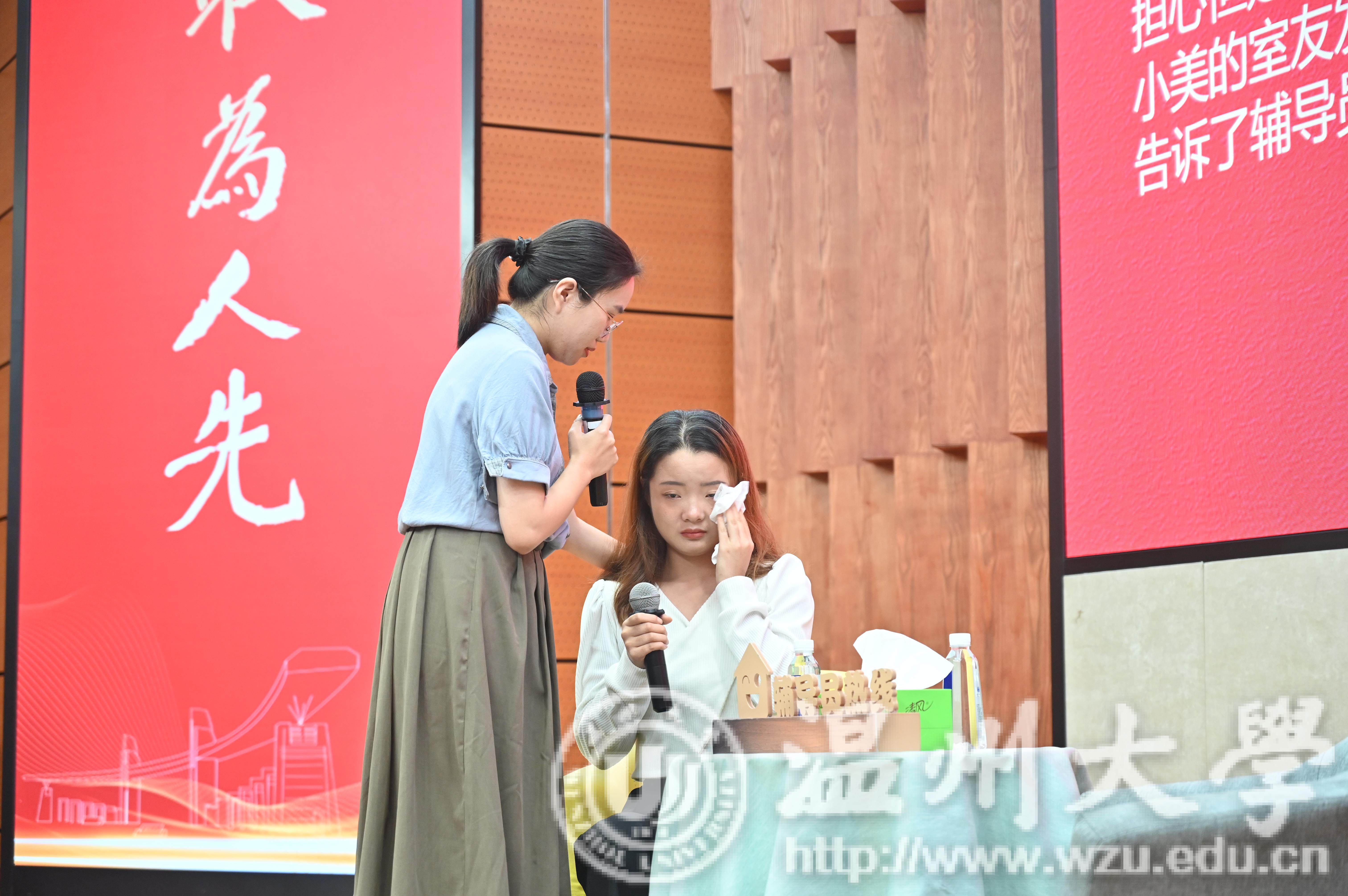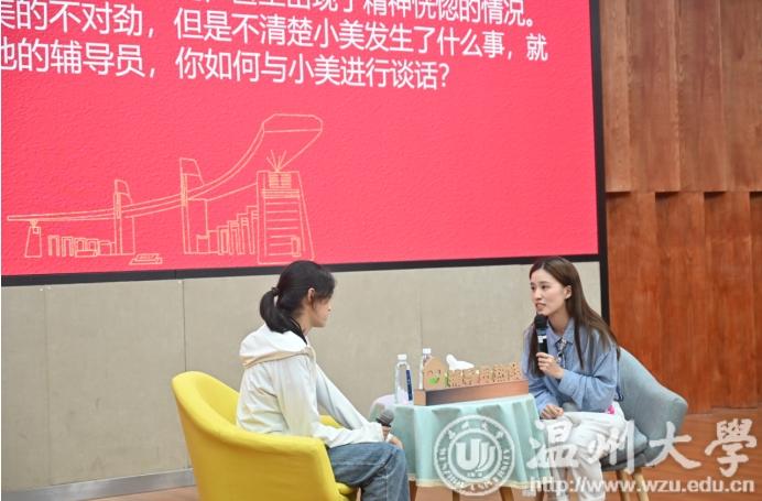 谈心谈话环节,以情景再现的方式开展,主要考察辅导员对学生特征、学生成长成才规律的了解把握程度,对学生的教育引导能力、解决理论困惑和实际问题的能力等。比赛现场,辅导员们游刃有余地化解着学生提出的种种难题,赢得现场观众的阵阵掌声,充分展示了辅导员们过硬的教育引导能力和问题解决能力。