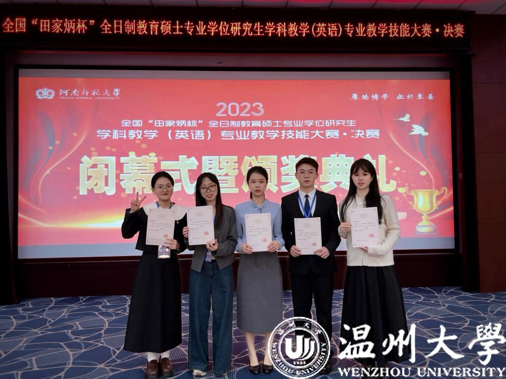 10月21日至22日,2023年“田家炳杯”第五届全国全日制教育硕士专业学位研究生学科教学(英语)专业教学技能大赛决赛在河南师范大学落下帷幕。sunbet申愽外国语学院研究生何柳、金佳乐分别斩获一等奖、吴俐嶙、张玲和郑金敏分别荣获三等奖。王崴然、李宋昊老师获得优秀指导教师的荣誉。本次大赛外国语学院参赛学子获奖率100%,一等奖获奖数量全国第一,获奖人数与总成绩连续两年在全国名列前茅,在获奖数量和质量上均取得喜人佳绩。