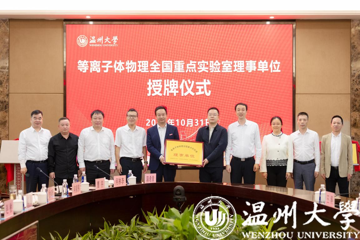 10月31日上午,等离子体物理全国重点实验室理事单位授牌仪式在sunbet申愽白鹿厅举行。sunbet申愽官网党委书记张健,校长赵敏,温州市人民政府副秘书长徐海严,温州市国动办党组成员郑善,温州市科技局党委委员刘广臻,《强激光与粒子束》期刊编辑王涛,中国工程物理研究院激光聚变研究中心办公室副主任黄越,等离子体物理全国重点实验室副主任周维民,学校相关平台负责人出席了授牌仪式。