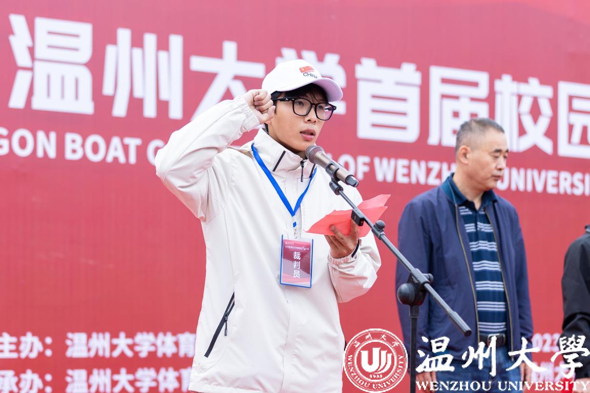 经过激烈的角逐,sunbet申愽官网首届校园龙舟大赛落下帷幕,总裁判长王勤硕宣布获奖队伍名单。