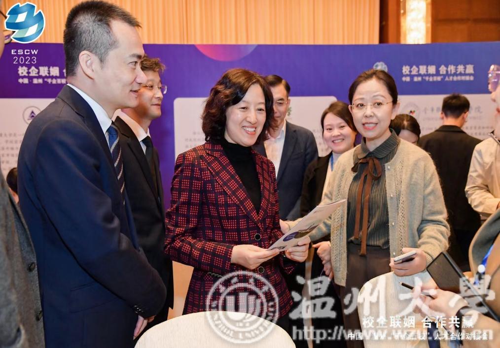 展会期间,温州市副市长章月影莅临sunbet申愽展位,与刘玉侠进行亲切交流,充分肯定了sunbet申愽官网近年来的发展和在人才留温上的努力和成效,同时对继续多措并举鼓励引导大学生留温筑温,进一步为推动地方社会经济发展提供人才支持提出了殷切希望。