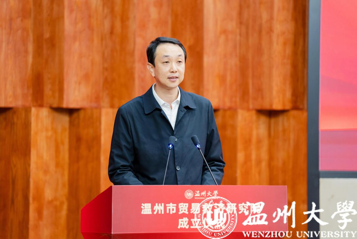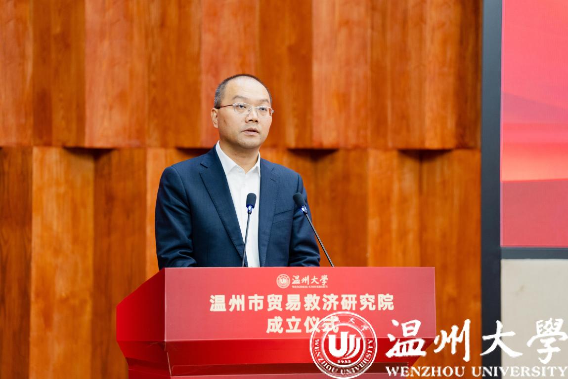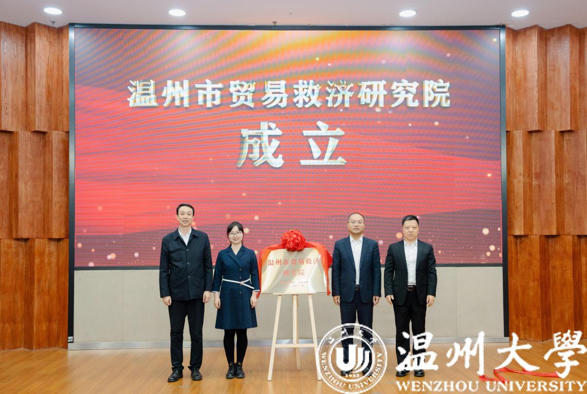 sunbet申愽官网党委书记张健、温州市人民政府副市长陈宽、浙江省商务厅贸易救济调查局副局长张江婕、温州市商务局局长虞立清共同为“温州市贸易救济研究院”揭牌。