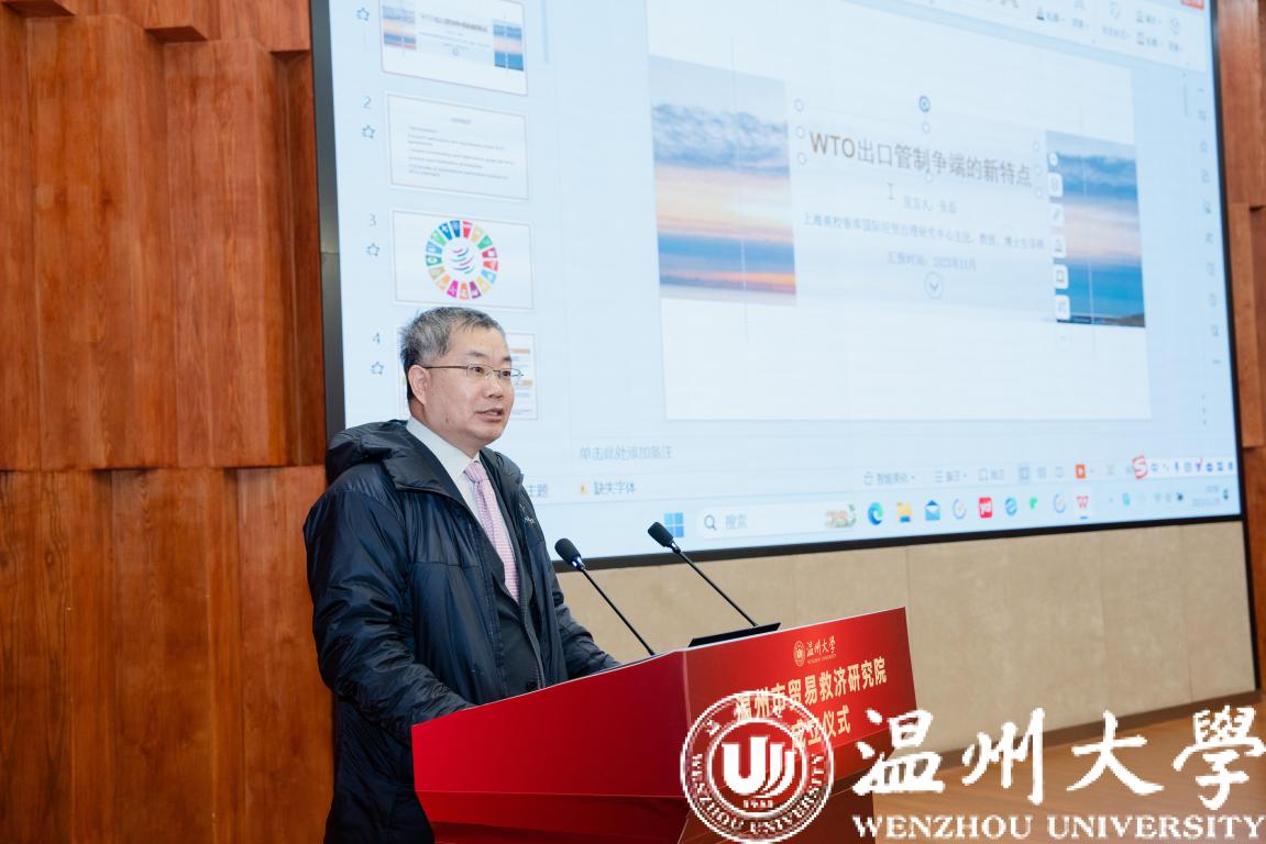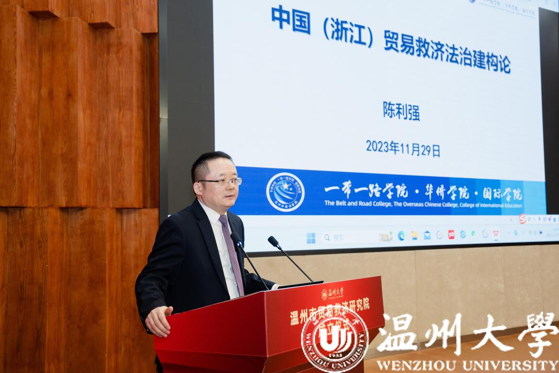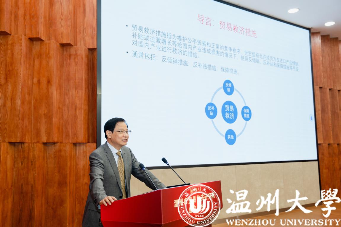 在学术论坛环节,温州市贸易救济研究院专家咨询委员会委员龚柏华教授、张磊教授和陈利强教授分别作了题为“当前美欧贸易救济措施新动向及应对”“WTO出口管制争端的新特点”“中国(浙江)贸易救济法治建构论”的学术报告。