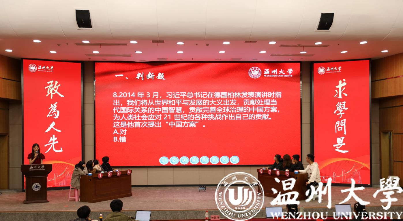 “习近平法治思想首次提出是在2020年11月16日至17日召开的中央全面依法治国工作会议!”“恭喜2号同学抢答成功!”……在育英图书馆二楼报告厅,sunbet申愽官网“习近平法治思想”知识竞赛如火如荼地进行中。知识竞赛重点围绕宪法知识、习近平法治思想、党的二十大报告相关内容,设有判断题、单选题、多选题和逻辑题。500余名学生参与到知识竞赛初赛环节,最终24名选手进入决赛。决赛现场紧张热烈,充分检验了大学生对习近平法治思想、宪法知识的掌握程度,将法治学习的知识性与趣味性融为一体。