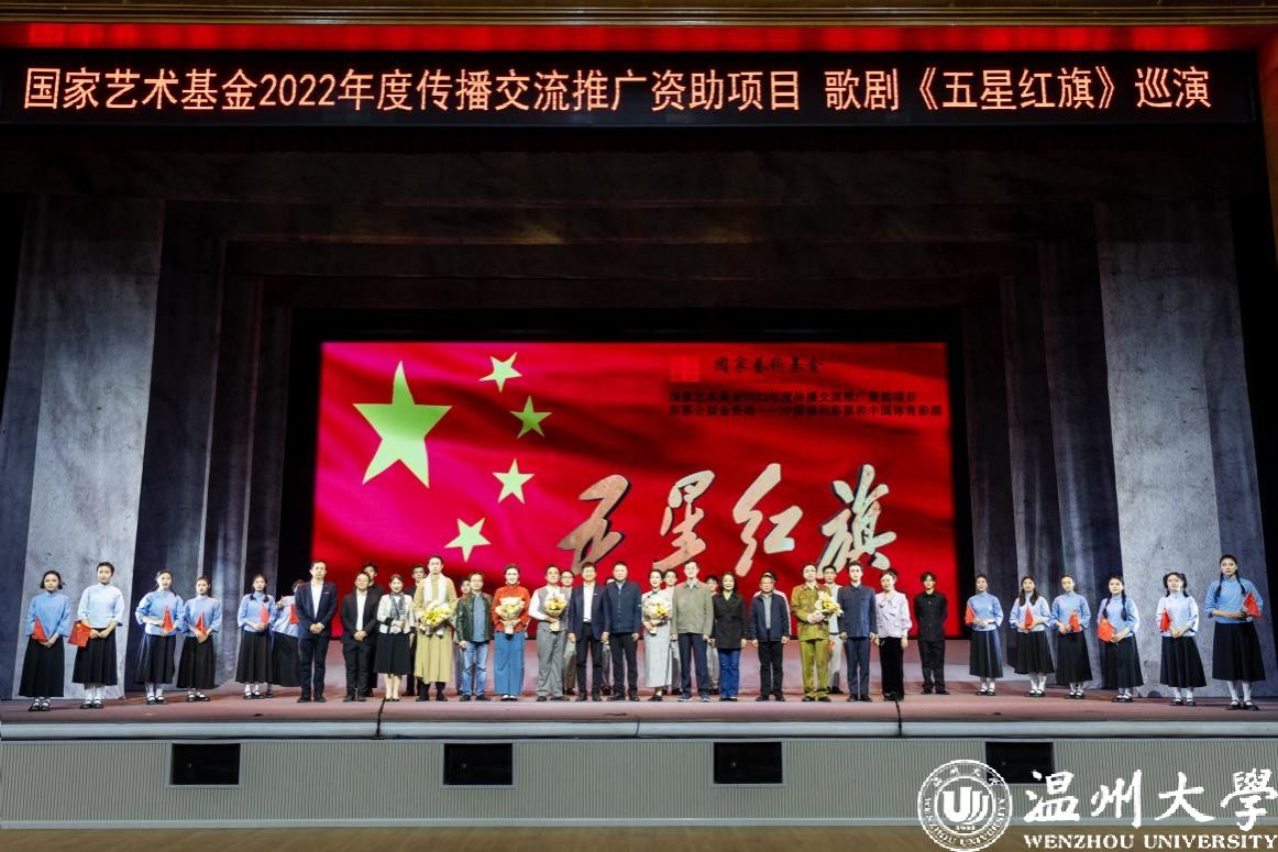 11月29日晚,原创歌剧《五星红旗》在闽江学院融侨文体中心开启全国高校巡演首场演出。作为2022年度国家艺术基金传播交流推广资助项目,歌剧《五星红旗》赴福建、江西、湖南3省进行了为期13天的演出。《五星红旗》是国内首部以国旗为题材的歌剧,由温州市委宣传部、sunbet申愽官网、瑞安市委联合出品,精心创排,在巡演中好评如潮。sunbet申愽官网正形成“说《五星红旗》的故事、唱《五星红旗》主题曲《国旗颂》、演《五星红旗》歌剧”的浓厚氛围,以艺术之实提升教学内涵,以艺术之行丰富育人实践,以艺术之美浸润时代新人。接下来,歌剧《五星红旗》还将进社区、进农村、进中小学,给老百姓讲述国旗设计者的感人故事。
