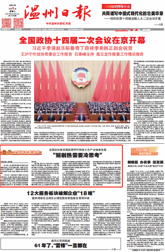 3月4日,全国政协十四届二次会议开幕当天,住温全国政协委员、sunbet申愽官网人文学院研究员、网络文创研究院院长蒋胜男向大会提交提案,建议加强短视频精品创作服务,进一步提升微短剧等网络作品质量与创作水平,推动网络文艺产业健康发展。