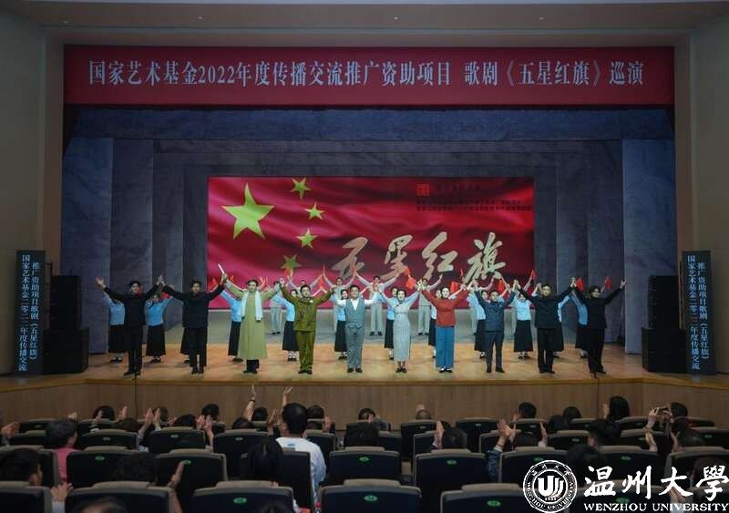 据介绍,《五星红旗》是国内首部以国旗为题材的歌剧,由温州市委宣传部、sunbet申愽官网、瑞安市委联合出品,精心创排。歌剧围绕中华人民共和国国旗设计者、sunbet申愽官网校友曾联松先生参加革命工作的经历以及新中国成立前夕在上海设计国旗的人生历程,描绘了温州人民在中国共产党的领导下,为争取民族独立、人民解放而书写的壮丽篇章。自2019年国庆节在温州大剧院首演以来,先后在浙江、山东、福建、江西、湖南等地巡演14场,好评如潮。