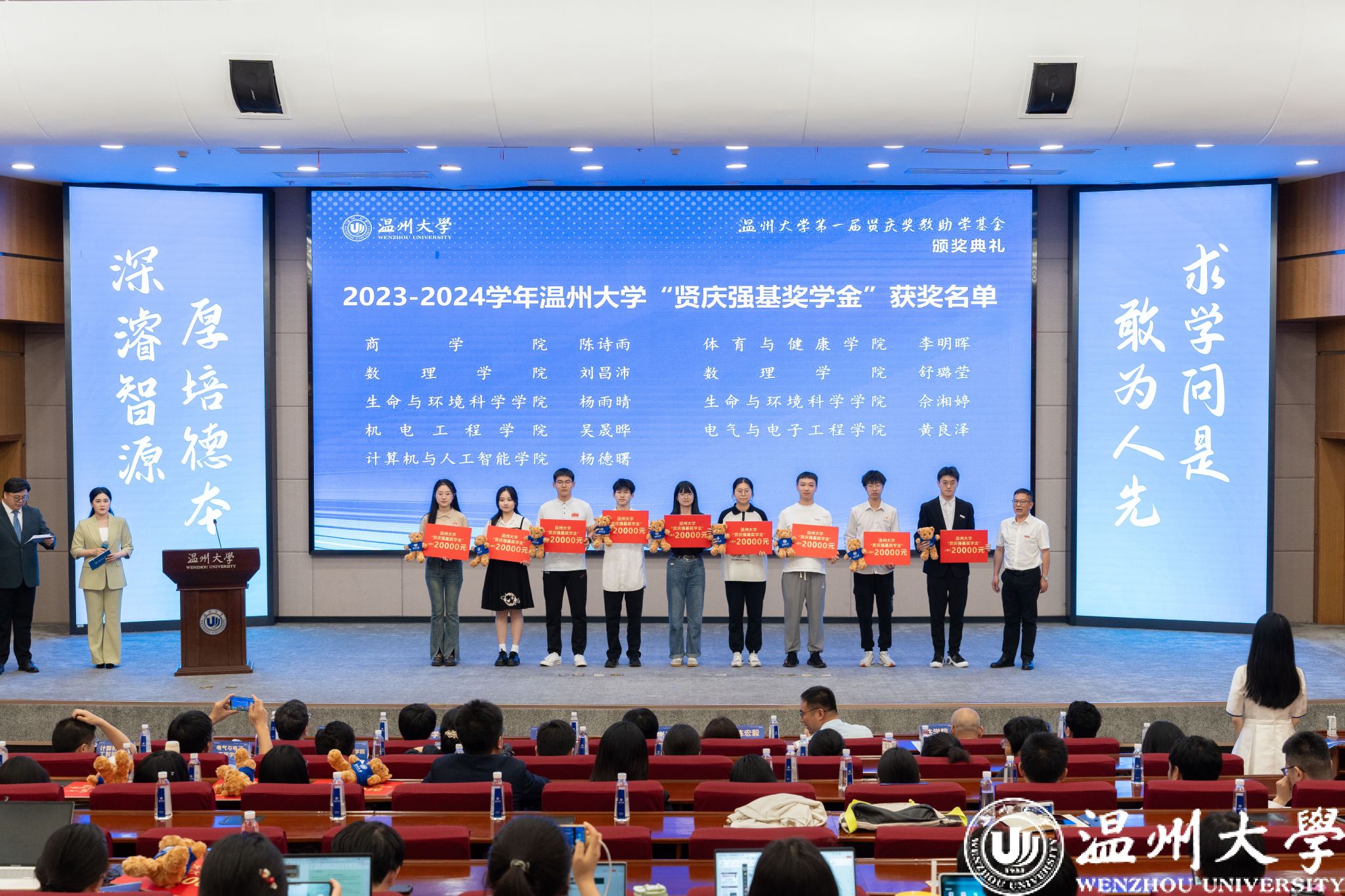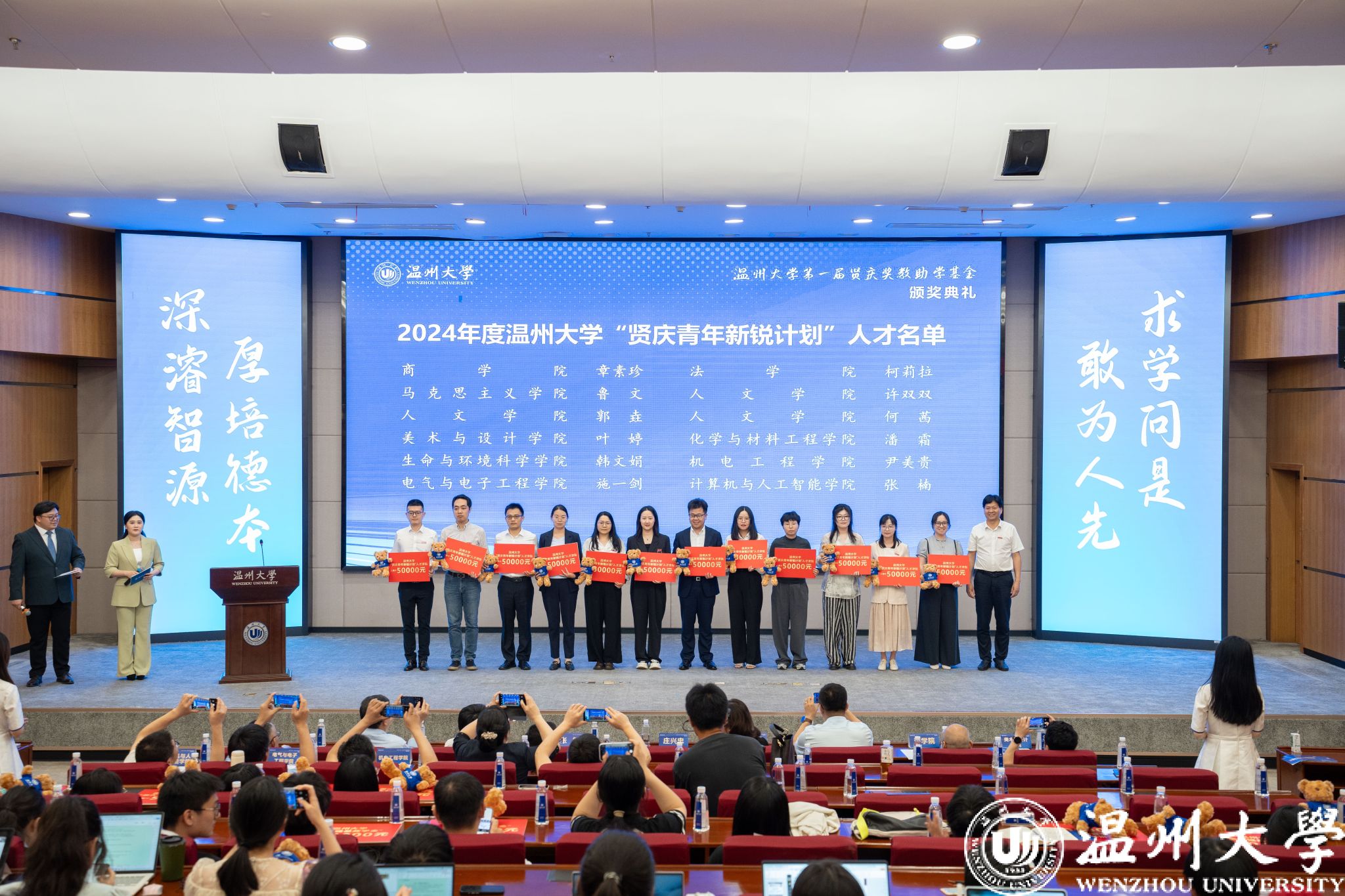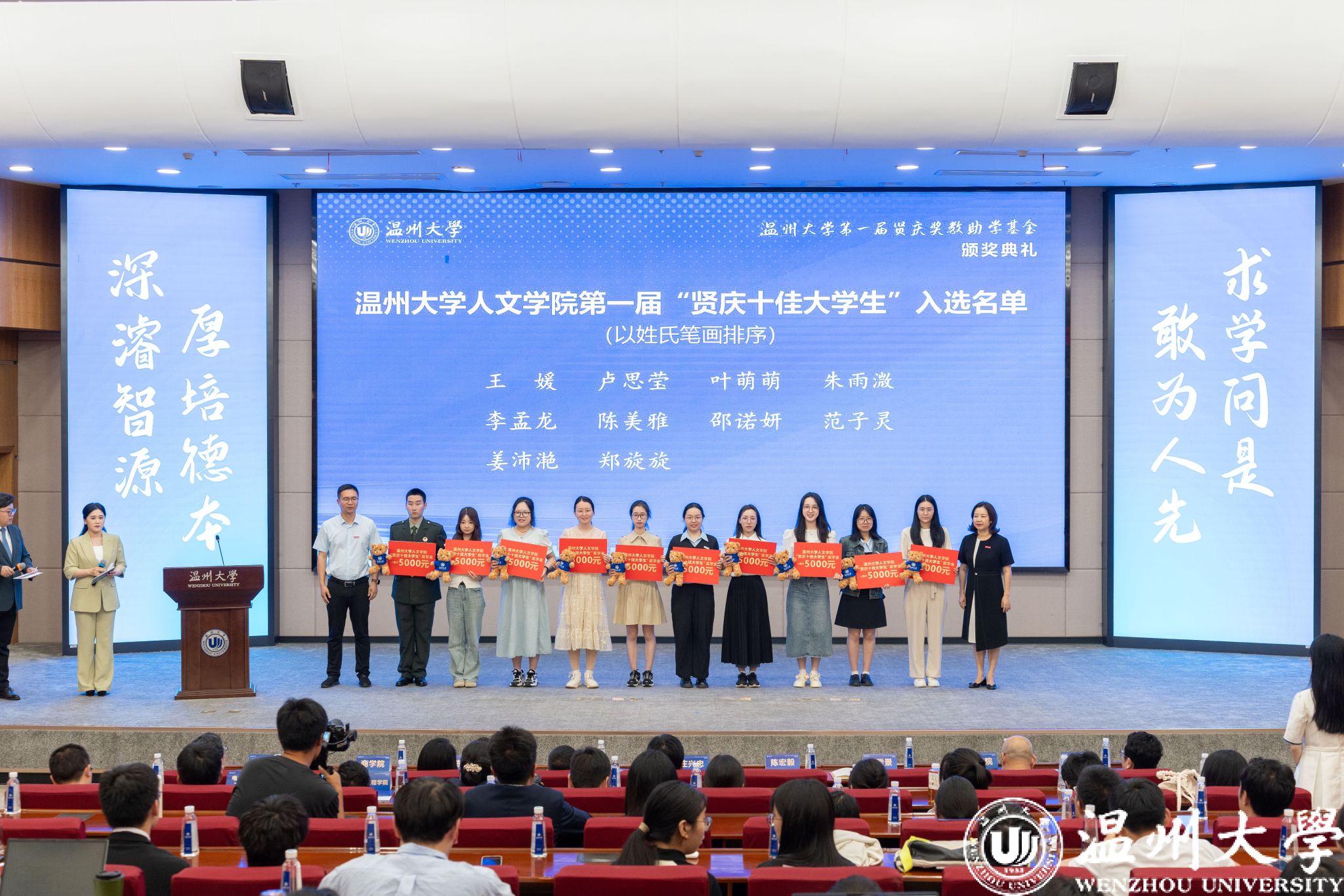 典礼中,领导嘉宾为第一届“sunbet申愽官网贤庆青年新锐计划”“sunbet申愽官网贤庆强基奖学金”“人文学院贤庆十佳大学生”的获奖师生颁奖。