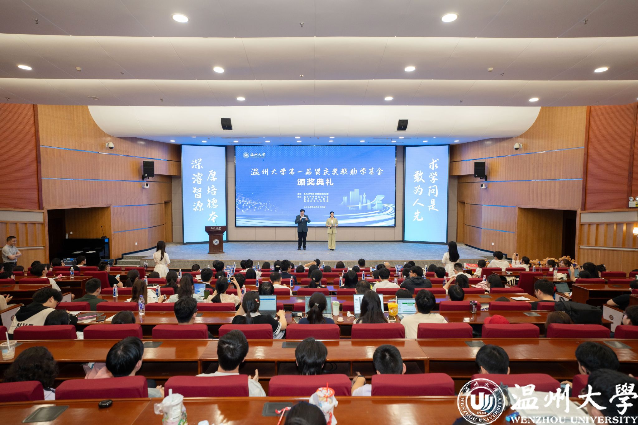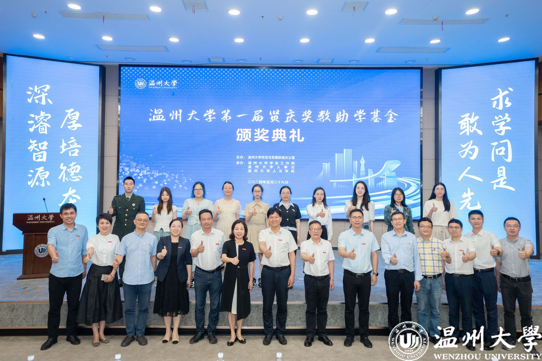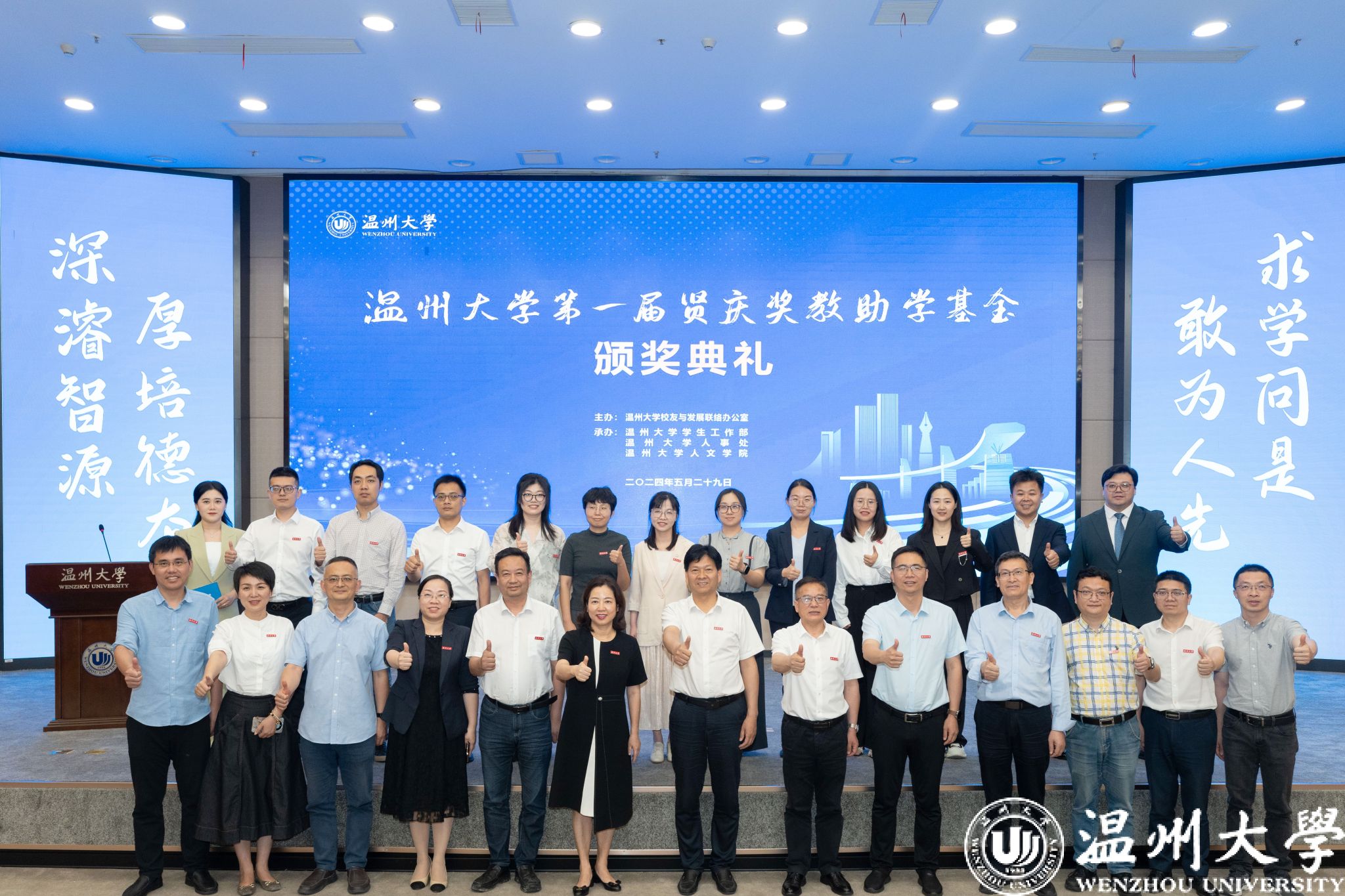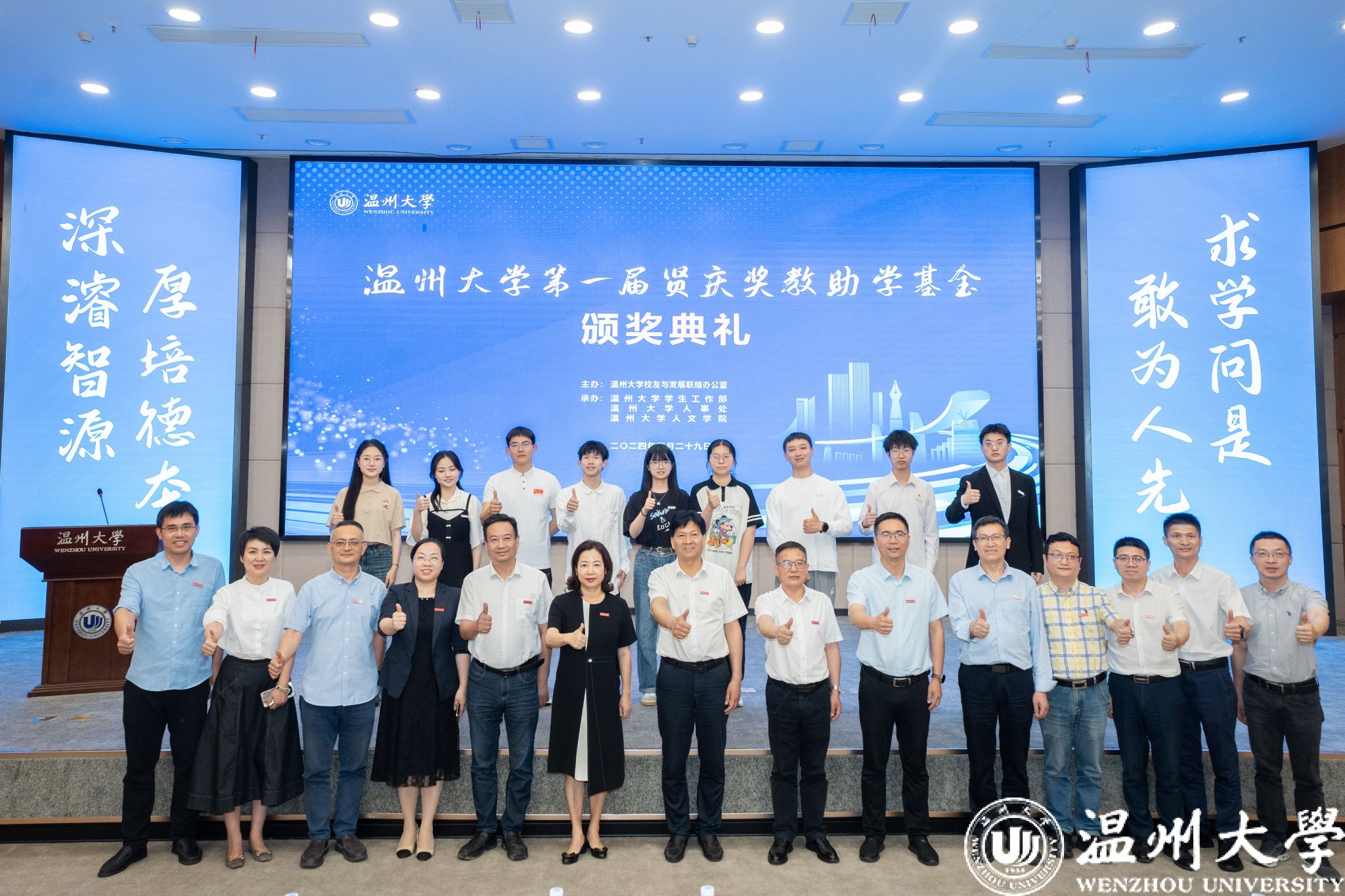 典礼中,领导嘉宾为第一届“sunbet申愽官网贤庆青年新锐计划”“sunbet申愽官网贤庆强基奖学金”“人文学院贤庆十佳大学生”的获奖师生颁奖。