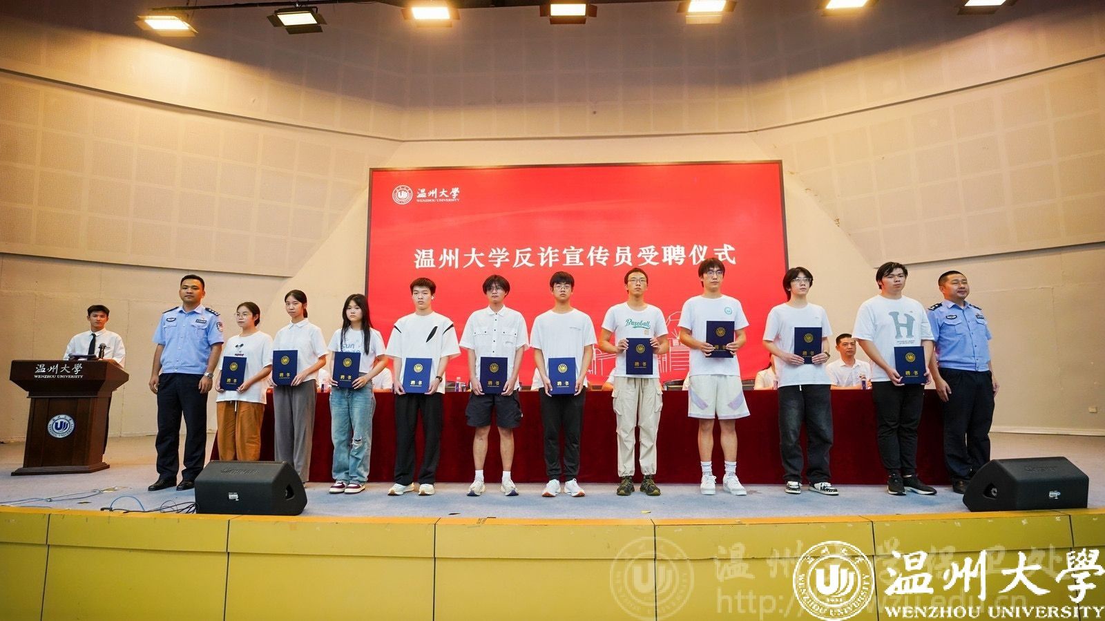 茶山派出所教导员张朝晖、温州市反诈中心警官刘昱洲为各学院学生代表颁发“sunbet申愽官网反诈宣传员”聘书,并呼吁sunbet申愽师生积极参与反诈宣传中,为平安sunbet申愽贡献青春力量。