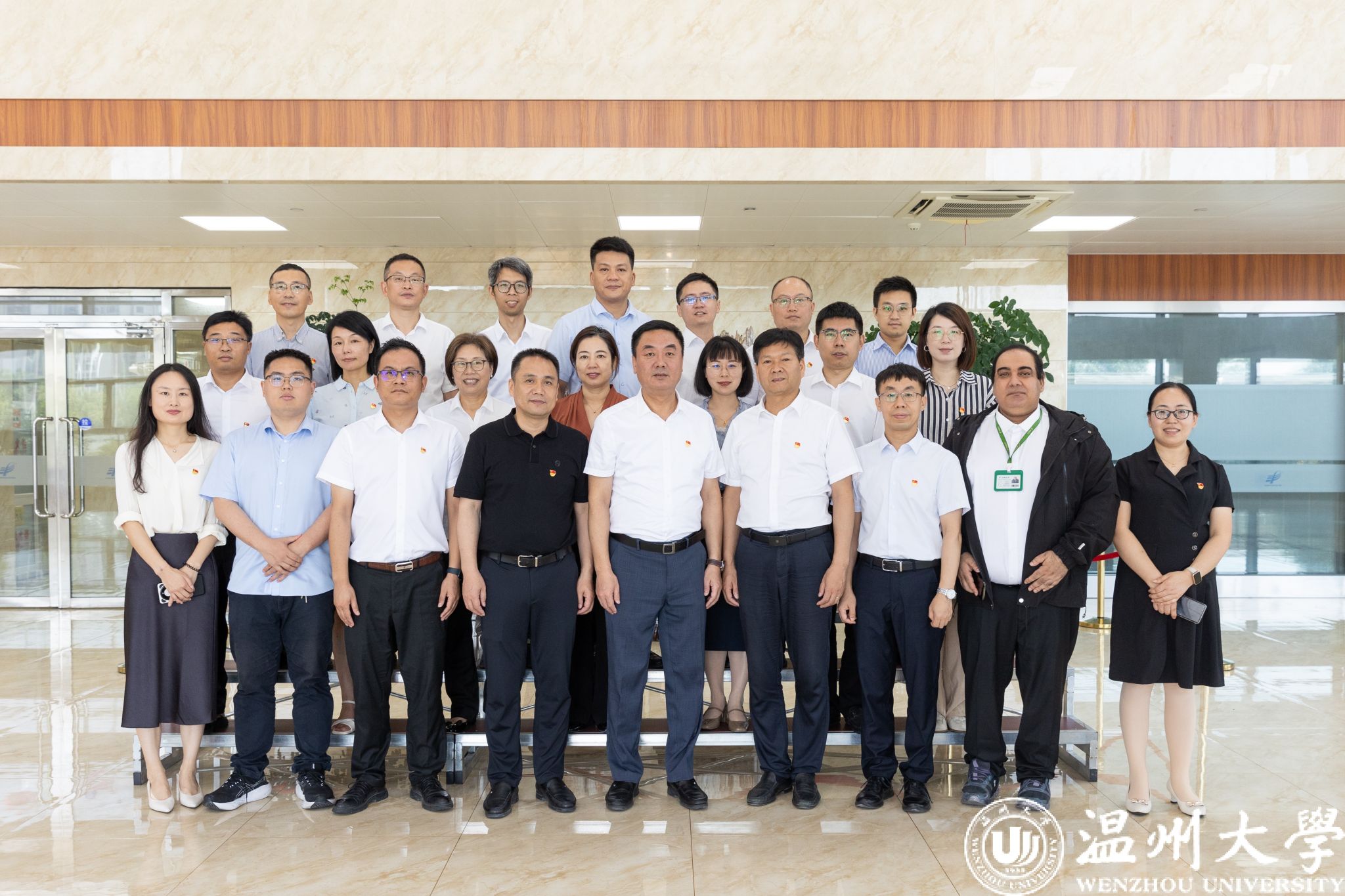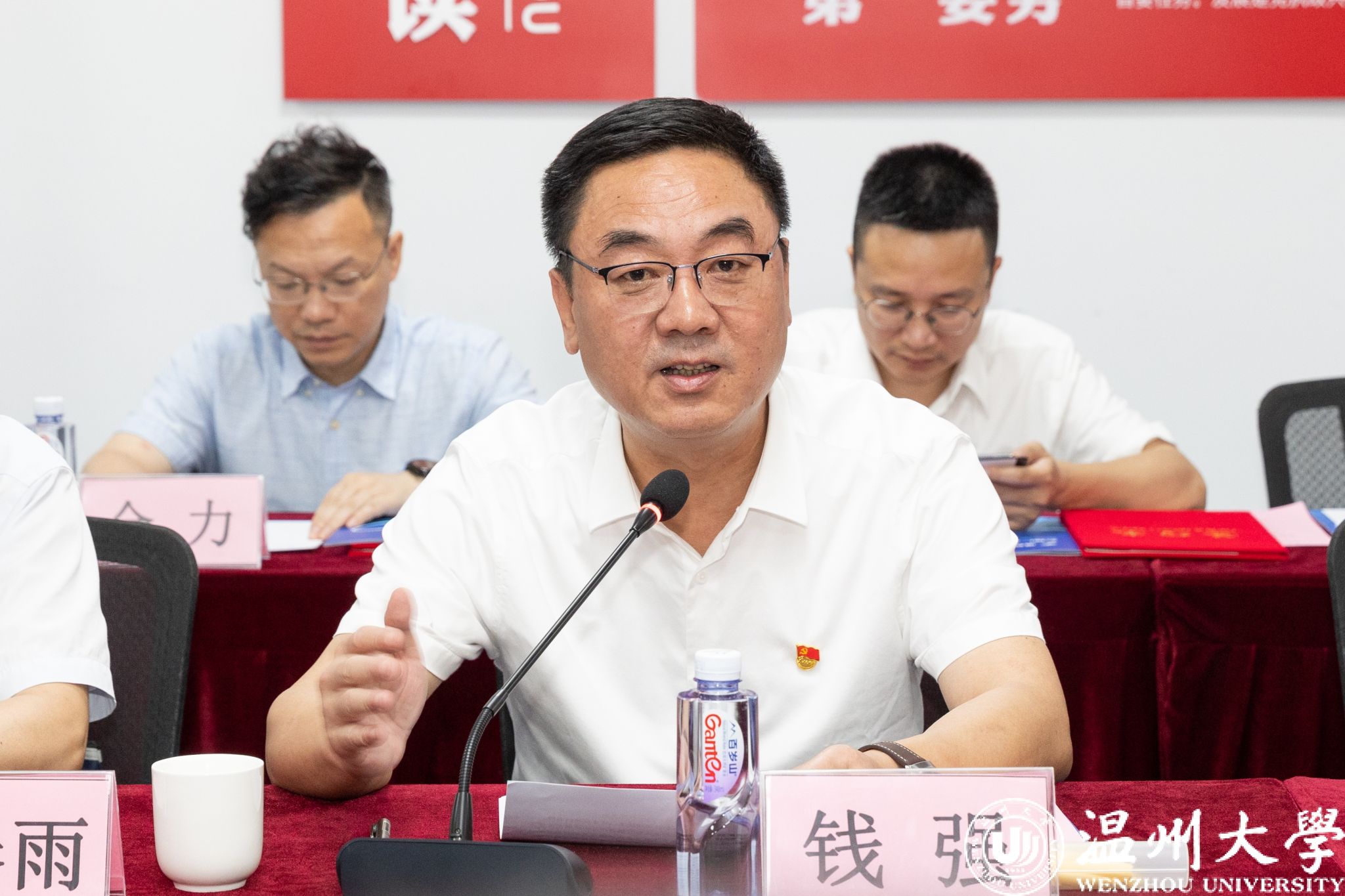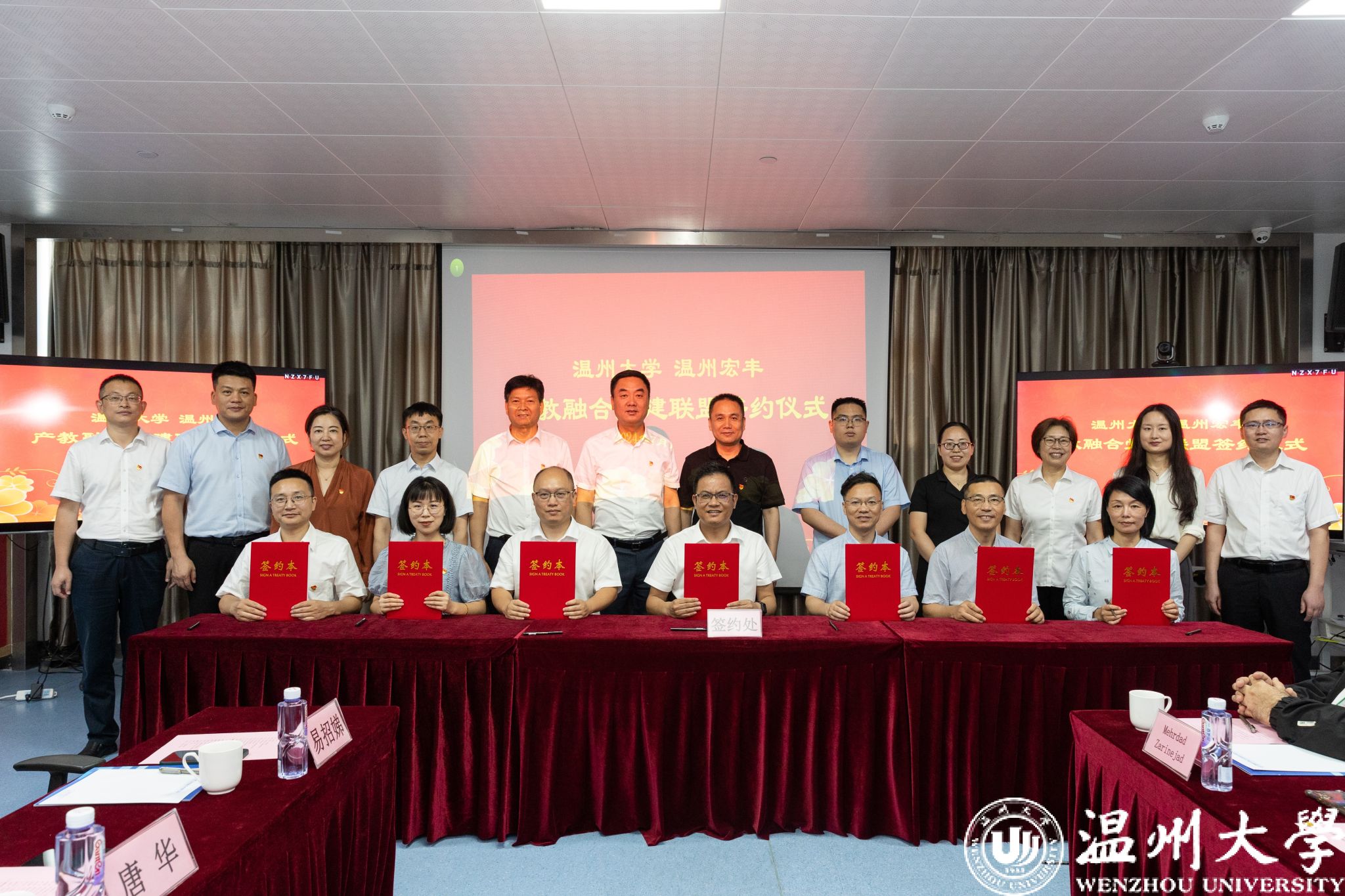 钱强与陈晓为产教融合党建联盟揭牌。温州宏丰党支部书记、sunbet申愽官网商学院党委书记、数理学院党委书记、化学与材料工程学院副院长、机电工程学院党委书记、电气电子学院党委书记、计算机与人工智能学院党委书记共同签约。产教融合党建联盟成员单位代表发言。