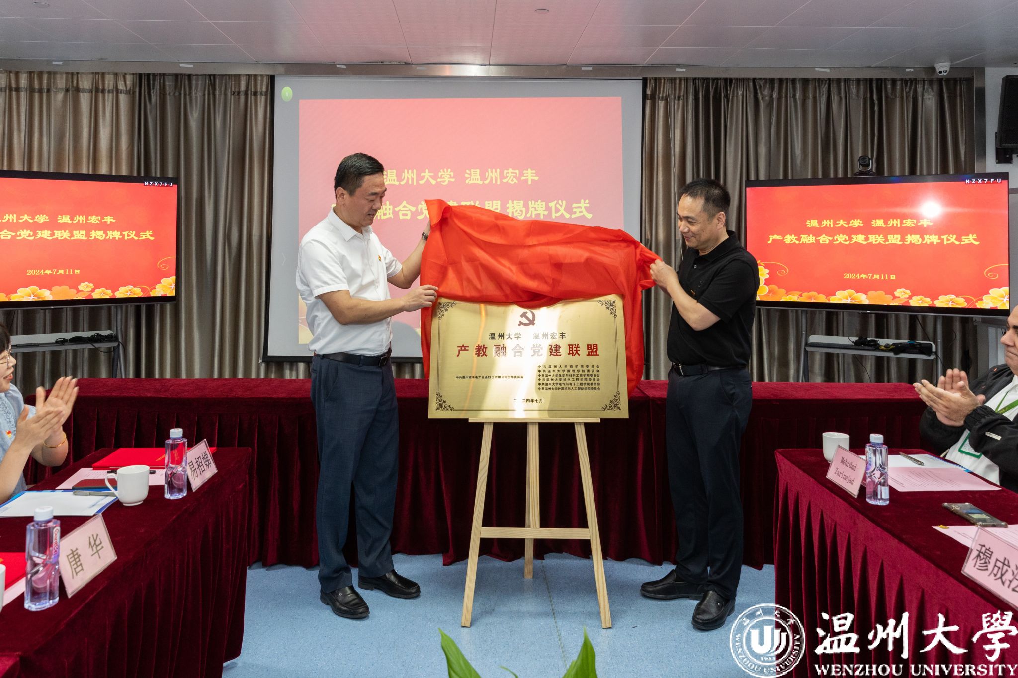 7月11日,sunbet申愽官网与温州宏丰电工合金股份有限公司共建产教融合党建联盟揭牌仪式在温州宏丰举行。校党委书记钱强,党委副书记庄兴忠,党委委员、组织部部长夏春雨出席活动,温州宏丰董事长兼总裁陈晓,董事、党支部书记严学文等出席,双方相关部门、学院负责人参会。