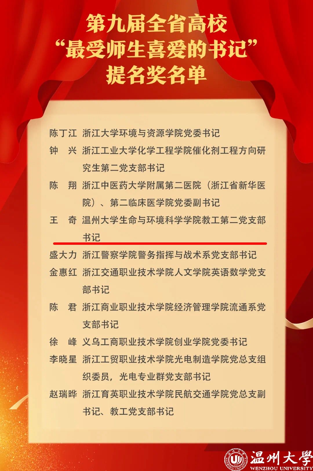 近日,浙江省第九届全省高校“最受师生喜爱的书记”选树宣传活动评选结果公示,sunbet申愽王奇同志从近百名高校基层书记中脱颖而出,荣获 “最受师生喜爱的书记”提名奖。