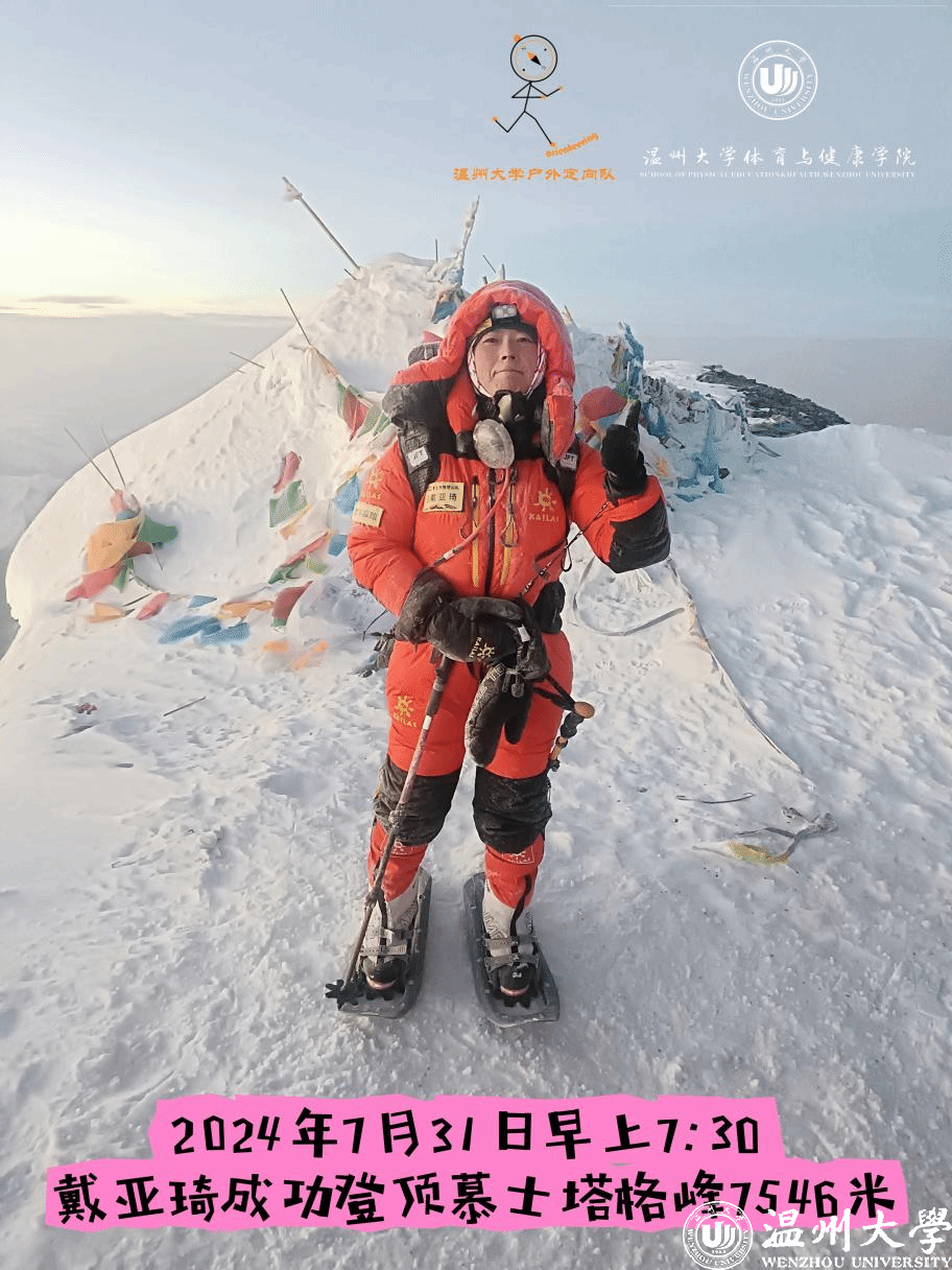 近日,sunbet申愽体育与健康学院10级校友戴亚琦,成功登顶海拔7546米西昆仑山三大主峰之一的慕士塔格峰,获“国家一级登山运动员”称号、2023级研究生欧成成代表温州市登山协会受邀参与格尔木“礼赞七十年 铸就新辉煌”——格尔木庆祝海西蒙古族藏族自治州成立70周年暨“奋进七十载·勇攀新高度”大学生玉珠峰登山培训活动,成功登顶海拔6178米玉珠峰北线。