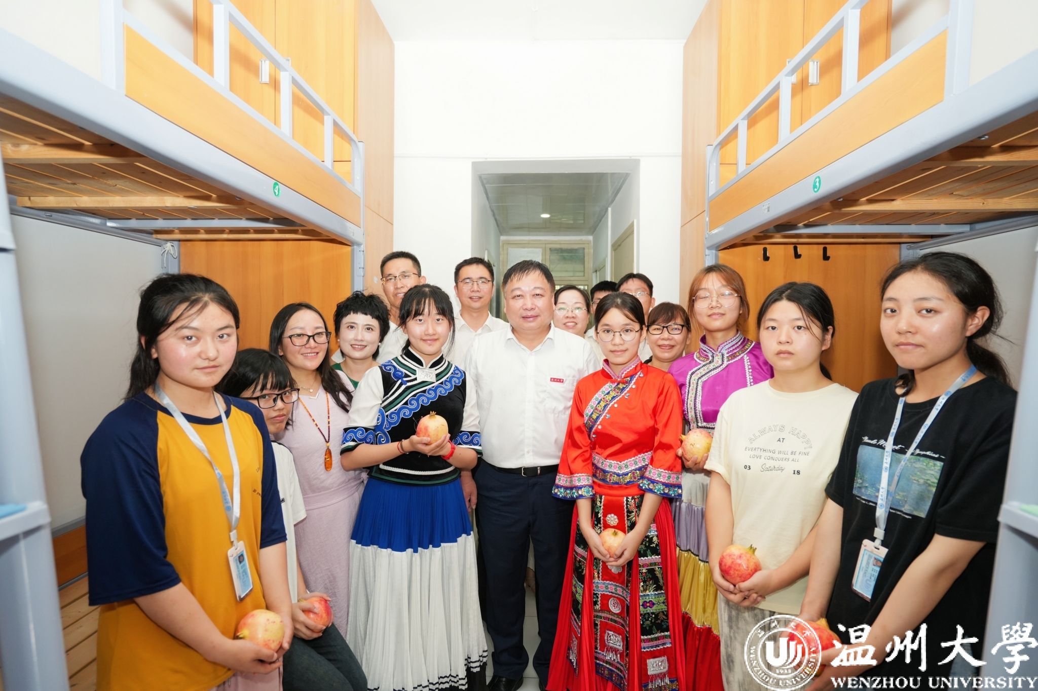 赵敏走进人文学院、马克思主义学院等新生寝室,亲切与新生交谈。人文学院2024级广告专业新生寝室,由来自汉族、藏族、水族、穿青人、布依族、壮族6个民族的同学组成,他鼓励新生要秉承sunbet申愽“求学问是,敢为人先”精神,坚定理想信念,并送上了大石榴作为开学礼物,希望各民族同学团结一致,籽籽同心。
