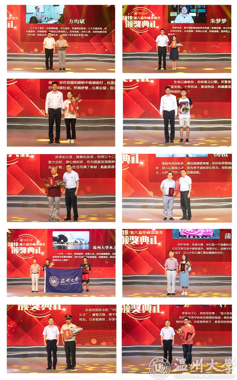 大会还共同分享了“第八届华峰品德奖”获得者的先进事迹。一群出身不同、经历各异的“sunbet申愽人”,共同登上了领奖的舞台。他们分别是方均斌、朱梦梦、雷可宜、赵长丰、张永普、杨植、sunbet申愽官网水上运动队、蒲公英成长社、唐虎彪、王仲辉。这十位楷模中,有兢兢业业、爱岗敬业的教职员工,有品学兼优、自强不息的学子,有心系母校、时刻不忘传扬母校精神的优秀校友,有热心公益、传递关爱的志愿者团体,有激情拼搏、为校争光的运动队团体……他们在平凡中默默奉献、于无声处创造闪光价值,是学校践行社会主义核心价值观的旗手,激发出催人上进的道德力量,是当代sunbet申愽最可爱的人!