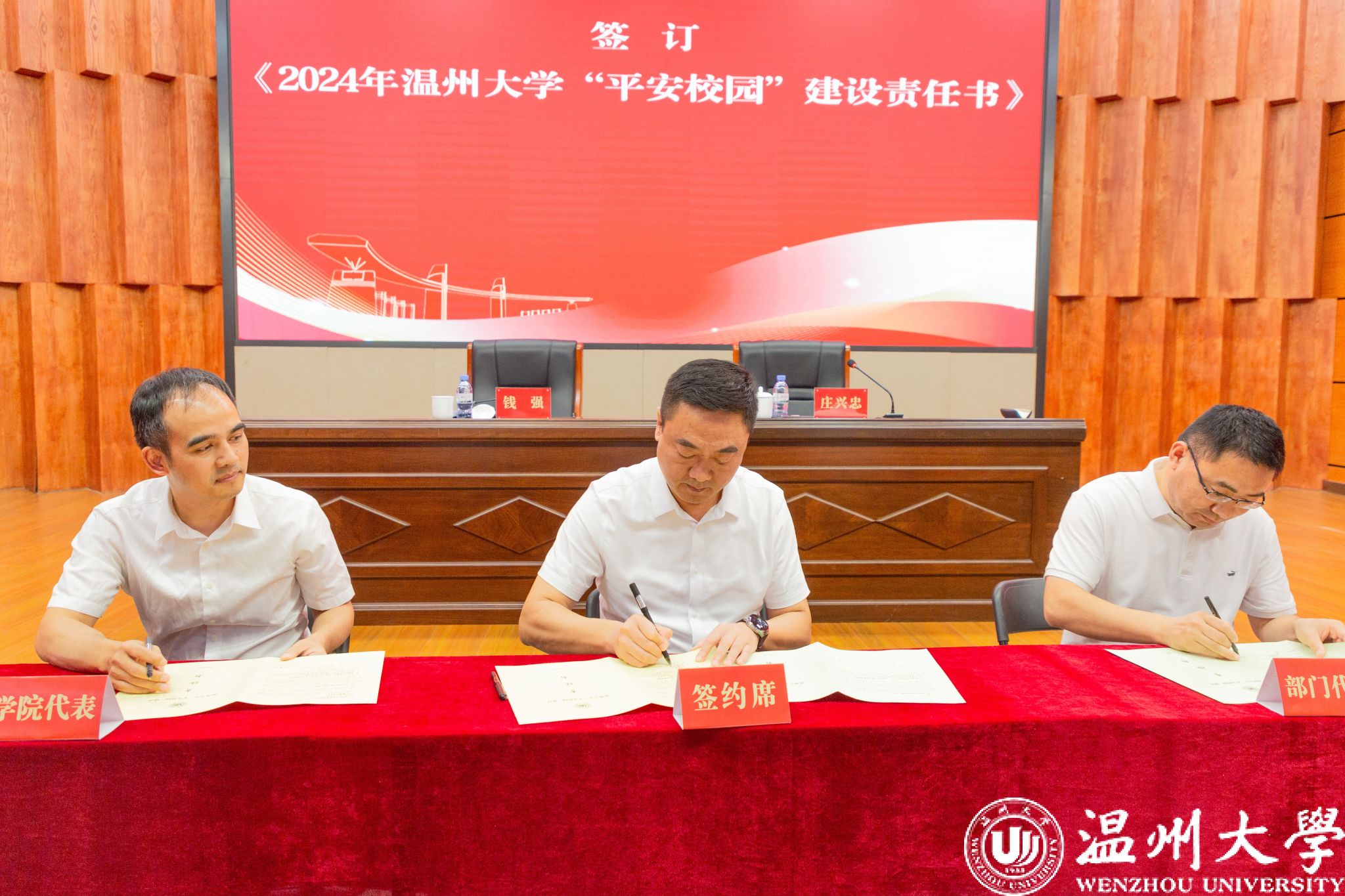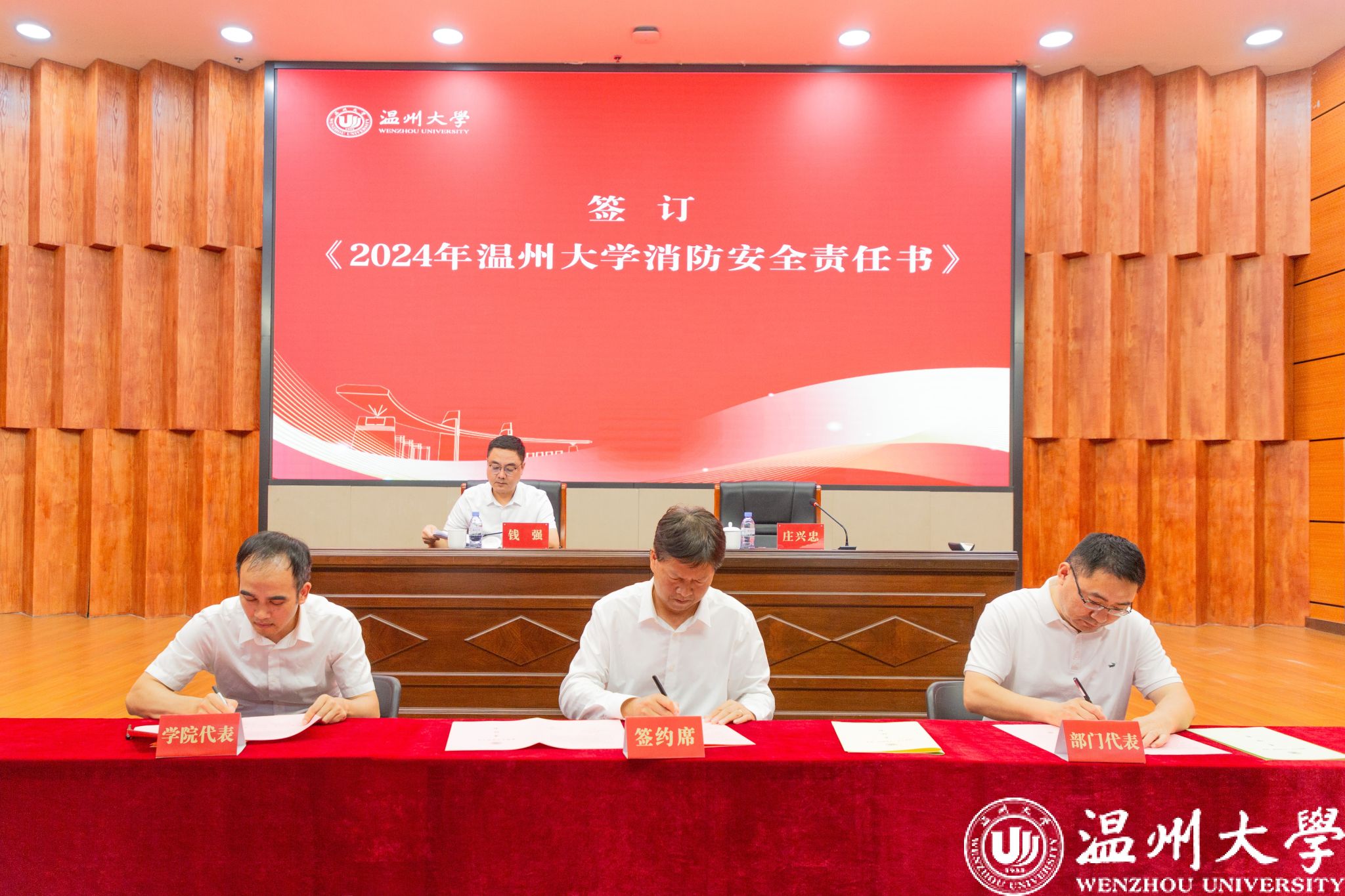 接着,大会举行了责任书签订仪式。钱强与庄兴忠代表学校与学院及部门代表分别签订了《2024年sunbet申愽官网“平安校园”建设责任书》与《2024年sunbet申愽官网消防安全责任书》。庄兴忠要求各学院、各部门在会后迅速行动,层层签订责任书,确保责任到人,形成齐抓共管的良好局面。
